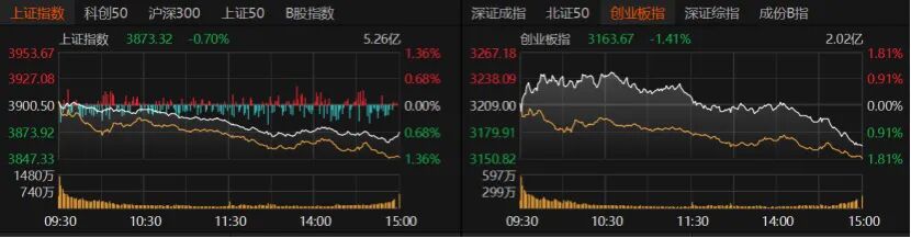 A股全天走弱,午后跌幅进一步扩大。指数表现上,沪指收跌0.7%报3873.32点,创业板指收跌1.41%报3163.67点,沪深300、上证50收跌,深证成指、科创50跌逾1%,但北证50逆市涨近4%。