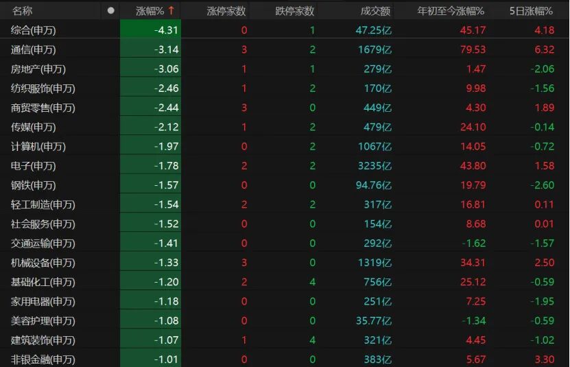 31个申万一级行业中,除了银行逆市飘红护盘,其余均收绿。跌幅超过2%的有6个板块,综合跌逾4%,通信、房地产回调幅度超过3%,纺织服饰、商贸零售跌逾2%。“牛市旗手”券商股也出现回落。