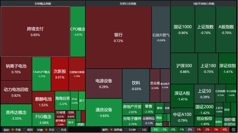 盘面上,银行板块护盘,麒麟电池、超导概念表现不错。但通信设备、CPO概念、英伟达概念、光电子器件等科技板块回调,昨日抬头的零售、房地产开发等板块也出现较大幅度的回调。