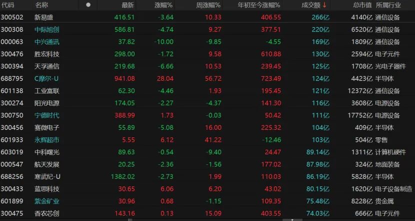 市场亏钱效应明显,4378只个股收跌,跌停股29只;1033只个股收涨,涨停股38只。具体来看,CPO(共封装光学技术)概念走弱,龙头股“易中天”(新易盛、中际旭创、天孚通信)也出现较大幅度回落,日成交额均靠前。因重组终止而昨日跌停的中科曙光,今日跌幅收窄至0.54%。新股摩尔线程继续上涨,今日大涨28.04%报941.08元/股,最新总市值为4423亿元。