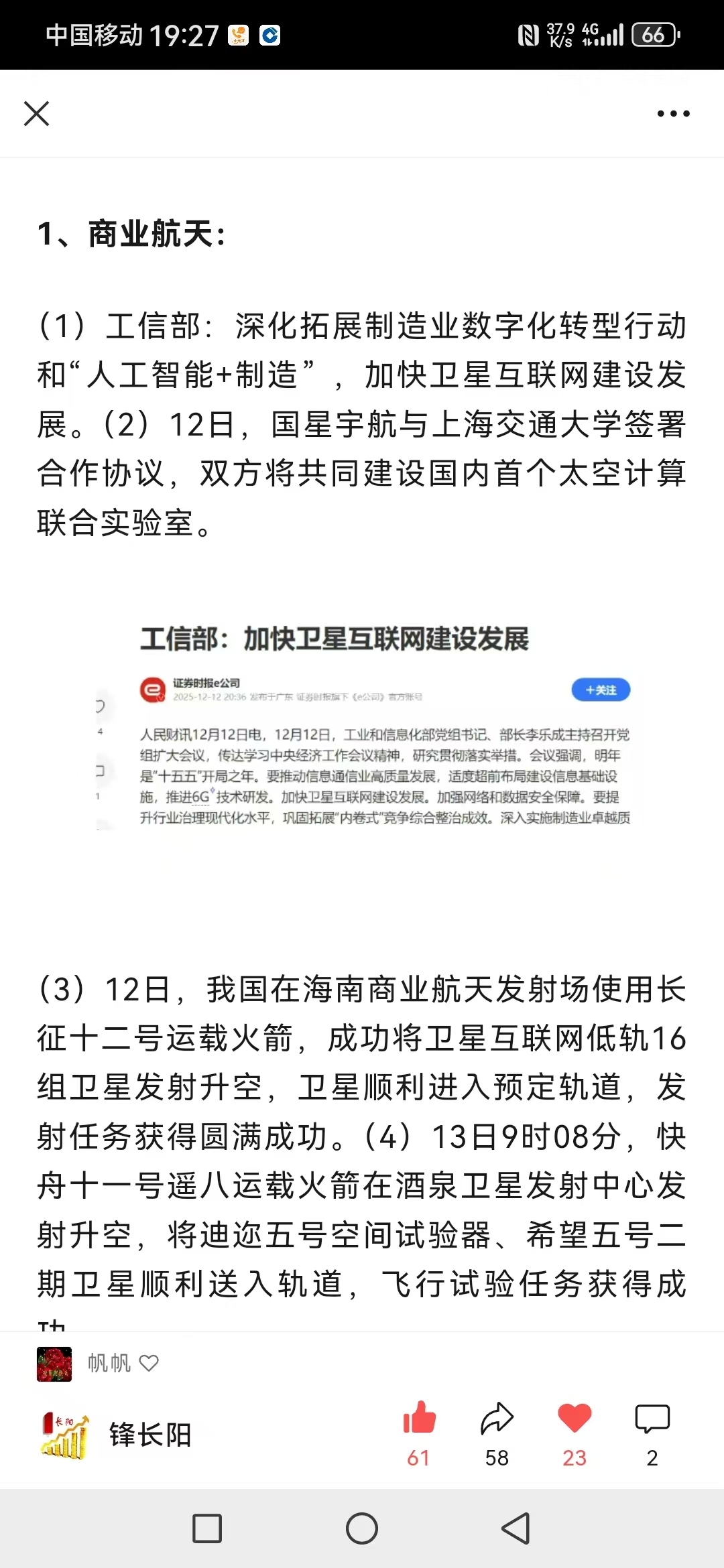 重磅利好,商业航天的重磅利好,领导要求加快卫星通信的建设利好中鸡旭创新易盛天孚通信,space要发行估值10万亿,还有领导要求增量,简单的说就是利好一箩筐啊好多利好