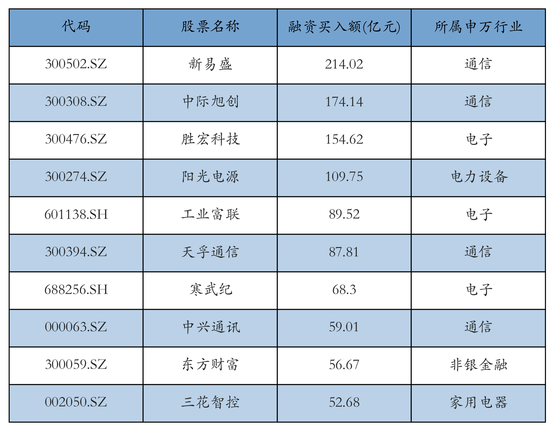 上周两市共有3464只个股有融资资金买入,共有173只个股买入金额超10亿元,其中新易盛、中际旭创、胜宏科技排名前三,买入金额分别214.02亿元、174.14亿元、154.62亿元。融资买入额前10个股详情见下表: