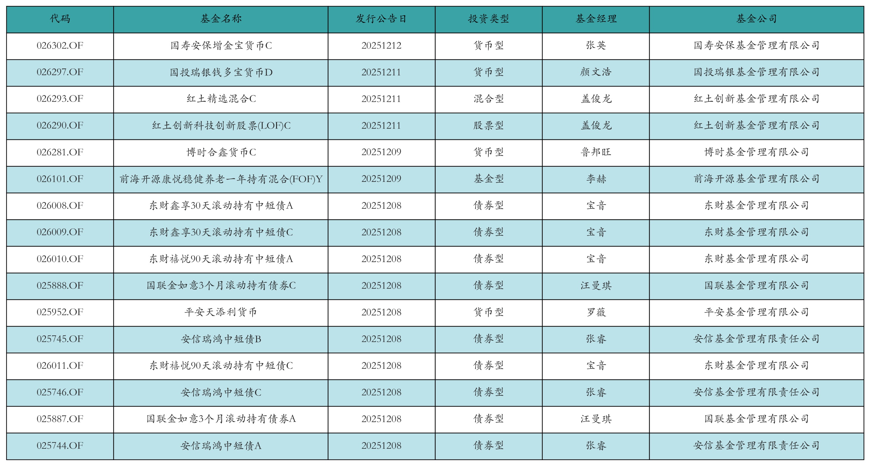 上周有16只新基金发行,分别为:国寿安保增金宝货币C、国投瑞银钱多宝货币D、红土精选混合C、红土创新科技创新股票(LOF)C、博时合鑫货币C、前海开源康悦稳健养老一年持有混合(FOF)Y、东财鑫享30天滚动持有中短债A、东财鑫享30天滚动持有中短债C、东财禧悦90天滚动持有中短债A、国联金如意3个月滚动持有债券C、平安天添利货币、安信瑞鸿中短债B、东财禧悦90天滚动持有中短债C、安信瑞鸿中短债C、国联金如意3个月滚动持有债券A、安信瑞鸿中短债A,详情见下表: