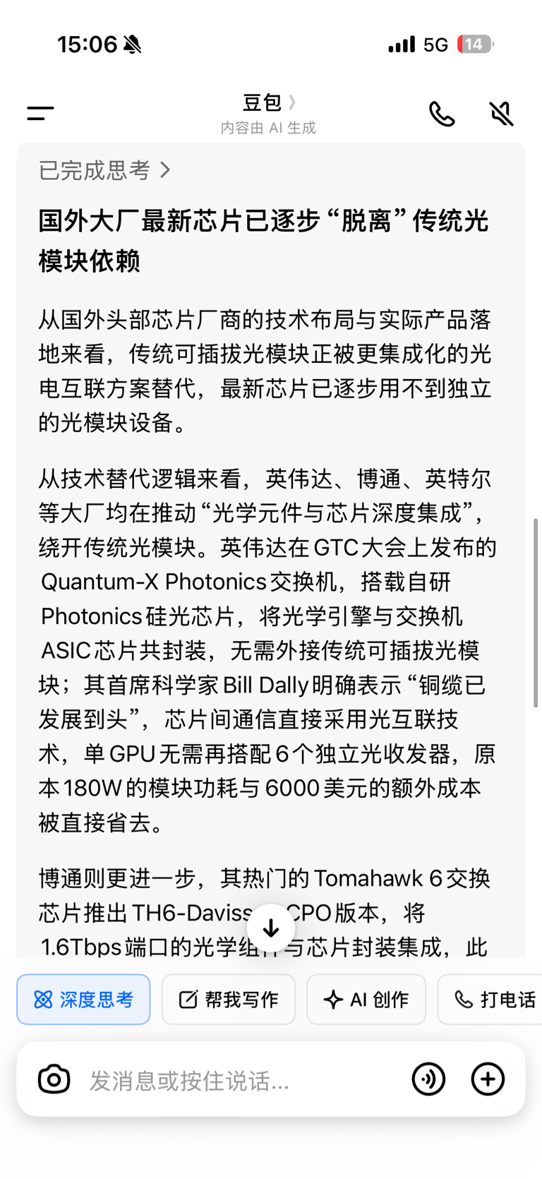 难怪天天跌了!豆包说光模块正在被国外大厂淘汰,现在已经有最新的光联方案了!