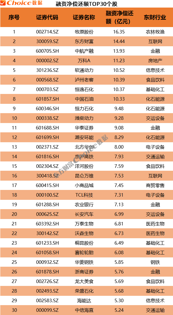 8只个股融资净偿还金额超10亿元,净偿还金额最大的个股是牧原股份,期间融资偿还额404.54亿元,融资买入额388.19亿元,净偿还16.35亿元;东方财富、中航产融、万科A排名第二、第三、第四,分别净偿还14.44亿元、13.93亿元、11.23亿元。(期间融资净偿还金额=期间融资偿还额-期间融资买入额)。
