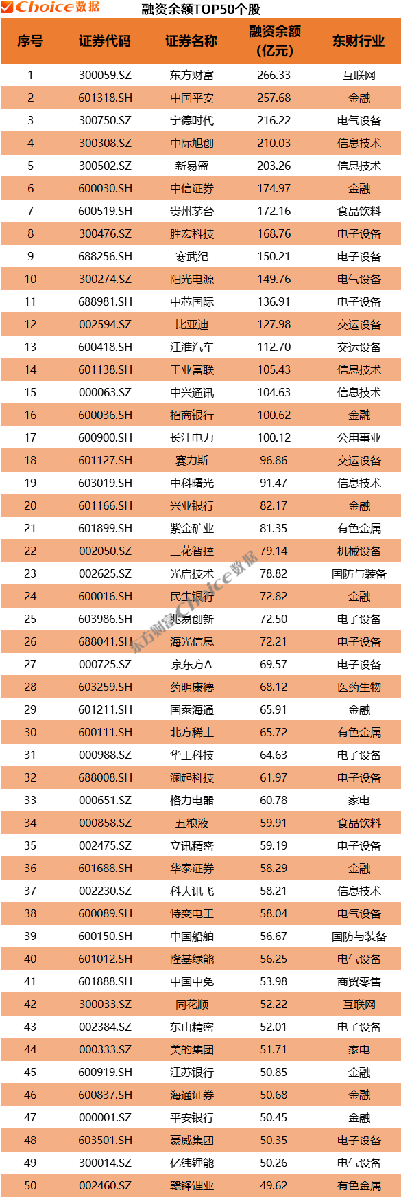 截至2025年末,A股融资资金持仓最大的个股是东方财富,融资余额高达266.33亿元;中国平安排名第二,融资余额257.68亿元;宁德时代、中际旭创、中信证券、新易盛、贵州茅台、寒武纪、中芯国际、比亚迪、工业富联、招商银行等融资余额超过百亿元。