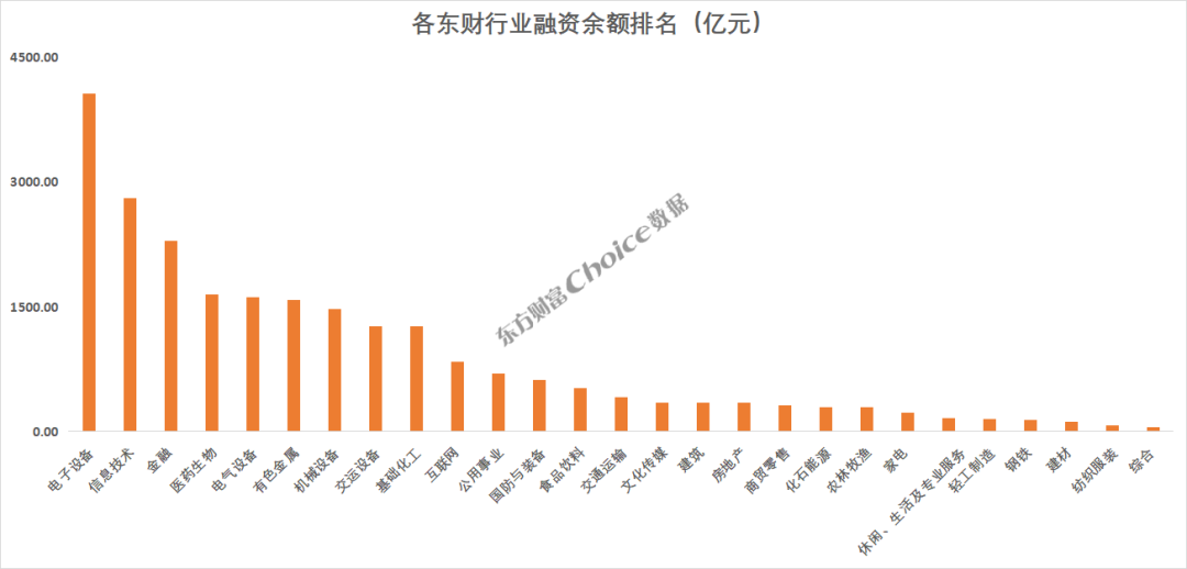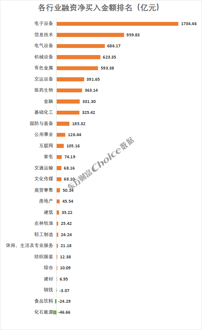 融资资金净买入额排名第二至第五的分别是信息技术、电气设备、机械设备和有色金属,分别净买入959.83亿元、686.17亿元、623.35亿元、593.38亿元。