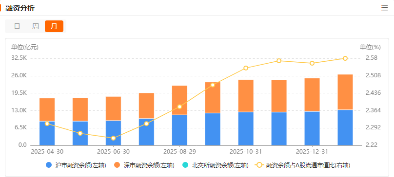 Choice数据统计,截至2025年末,A股融资余额累计2.52万亿元,占A股流通市值的2.56%。全年净买入金额6698.84亿元,刷新历史新纪录。