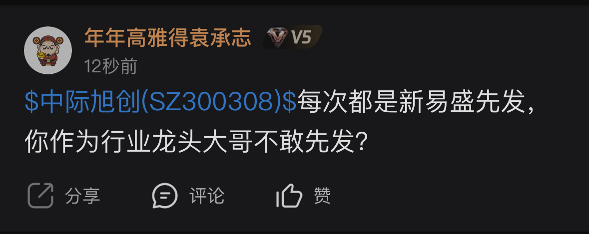 $新易盛(SZ300502)$ 每次都是新易盛先发,这次必须得等中际旭创发了之后新易盛再发了!!
