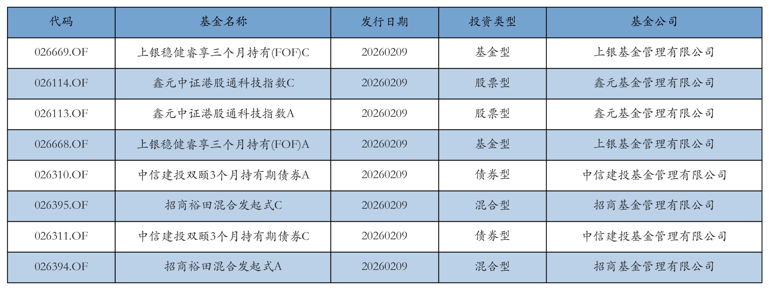 昨日有8只新基金发行,分别为:上银稳健睿享三个月持有(FOF)C、鑫元中证港股通科技指数C、鑫元中证港股通科技指数A、上银稳健睿享三个月持有(FOF)A、中信建投双颐3个月持有期债券A、招商裕田混合发起式C、中信建投双颐3个月持有期债券C、招商裕田混合发起式A,详情见下表: