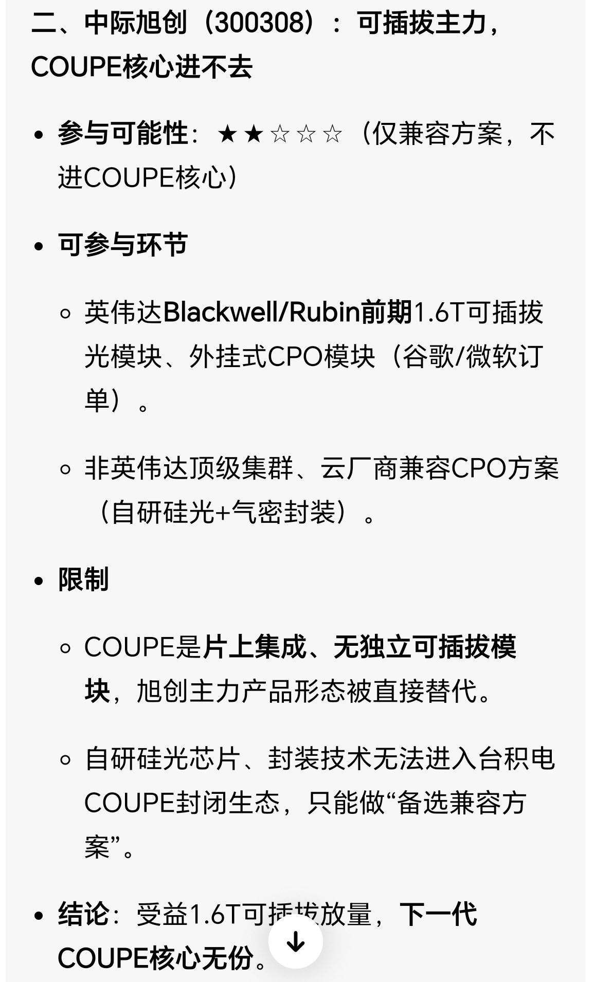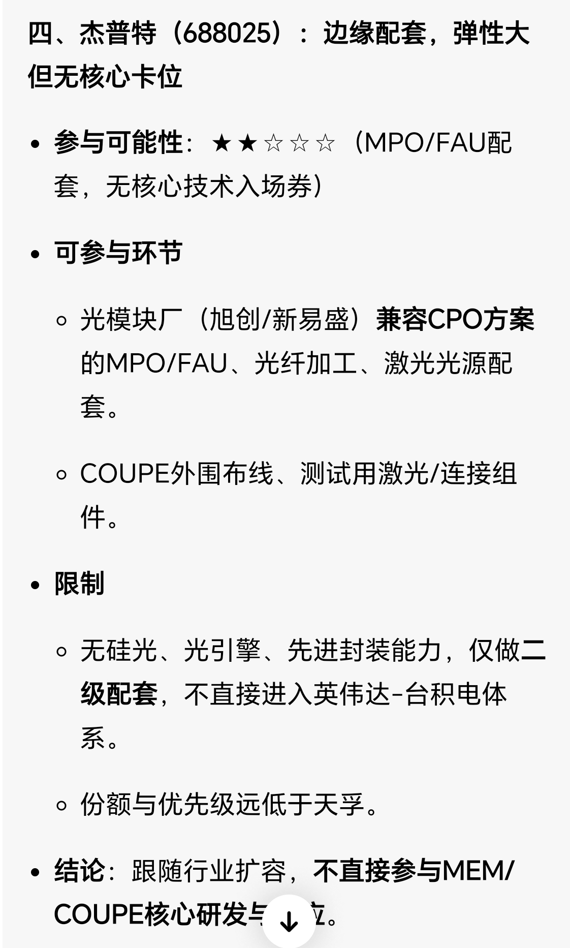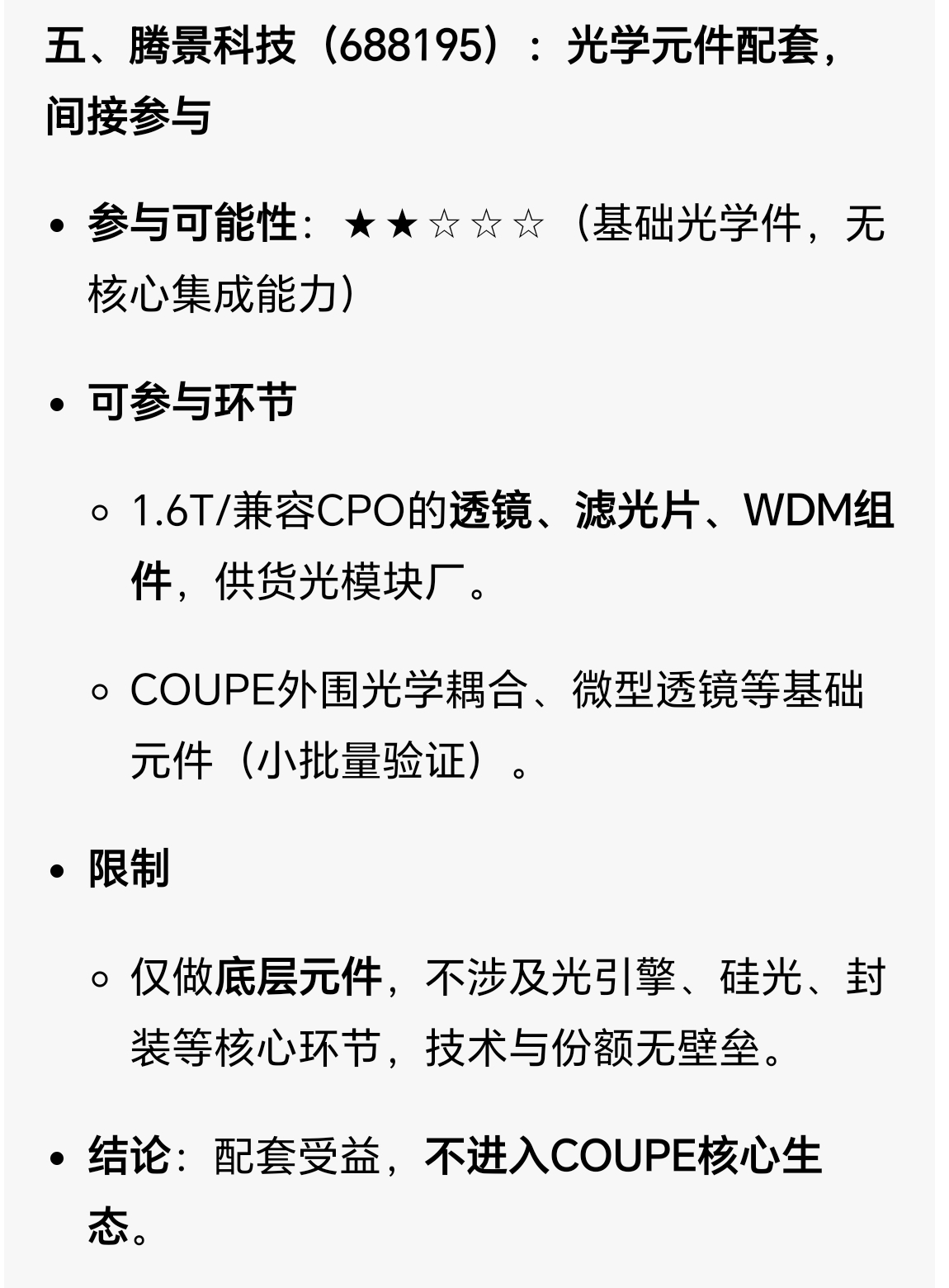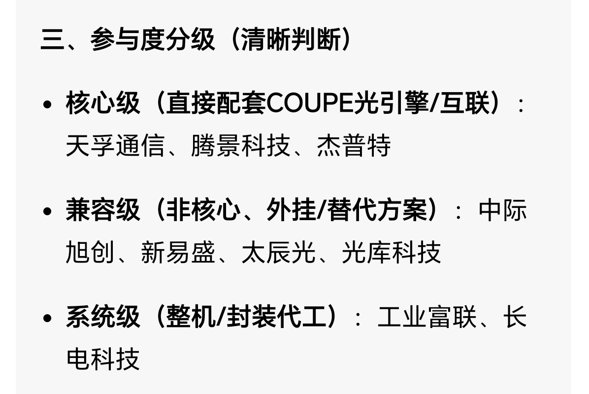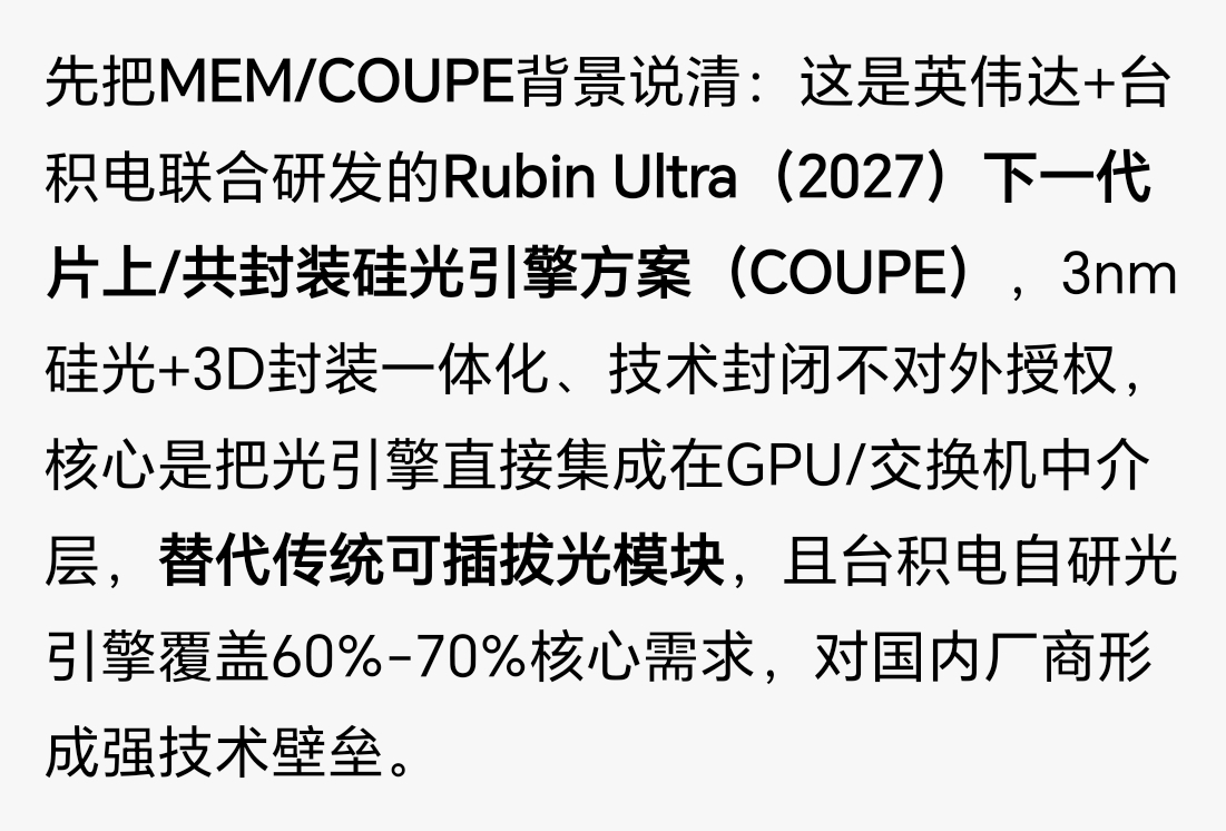 先把MEM/COUPE背景说清:这是英伟达+台积电联合研发的Rubin Ultra(2027)下一代片上/共封装硅光引擎方案(COUPE),3nm硅光+3D封装一体化、技术封闭不对外授权,核心是把光引擎直接集成在GPU/交换机中介层,替代传统可插拔光模块,且台积电自研光引擎覆盖60%-70%核心需求,对国内厂商形成强技术壁垒。