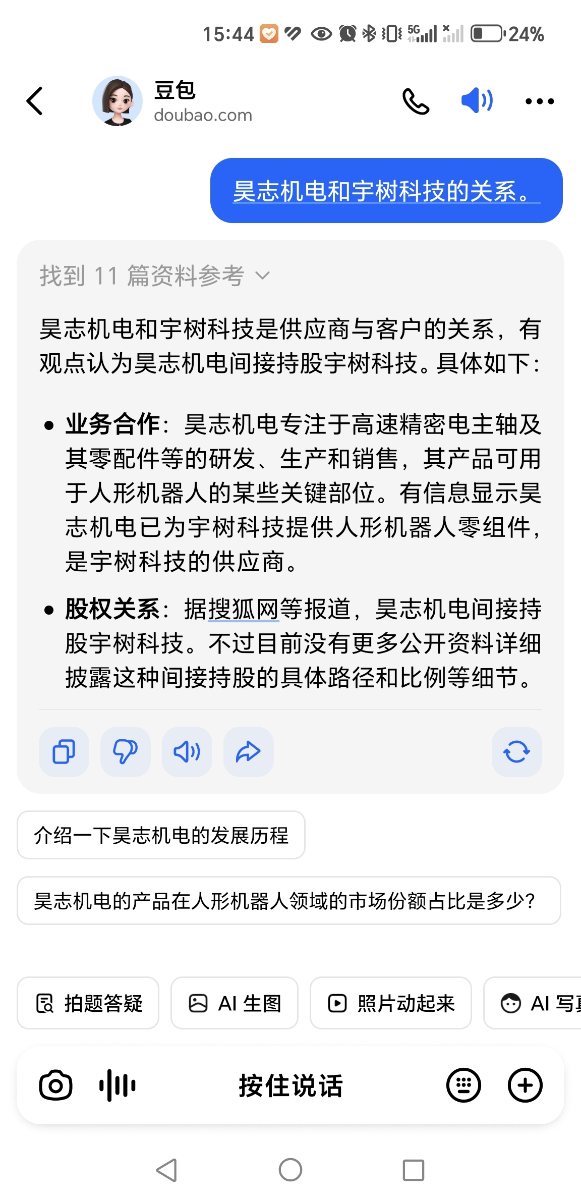 $昊志机电(SZ300503)$ 昊志和宇树的关系,豆包这样说