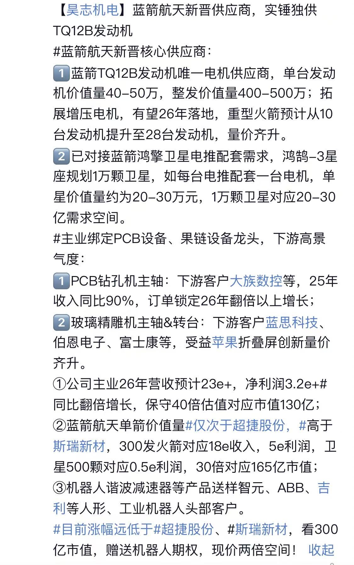 $昊志机电(SZ300503)$ 公司还与长安汽车合作开发自动充电机器人项目,与蓝箭航天等商业航天企业合作开发产品。公司预计明年收入将增长40%至50%,净利润约3.2 亿,毛利率和净利率有望保持在较高水平。