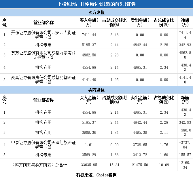 深交所2025年12月25日交易公开信息显示,昊志机电因属于日涨幅达到15%的前5只证券而登上龙虎榜。昊志机电当日报收43.42元,涨跌幅为20.01%,换手率21.76%,振幅17.69%,成交额21.28亿元。
