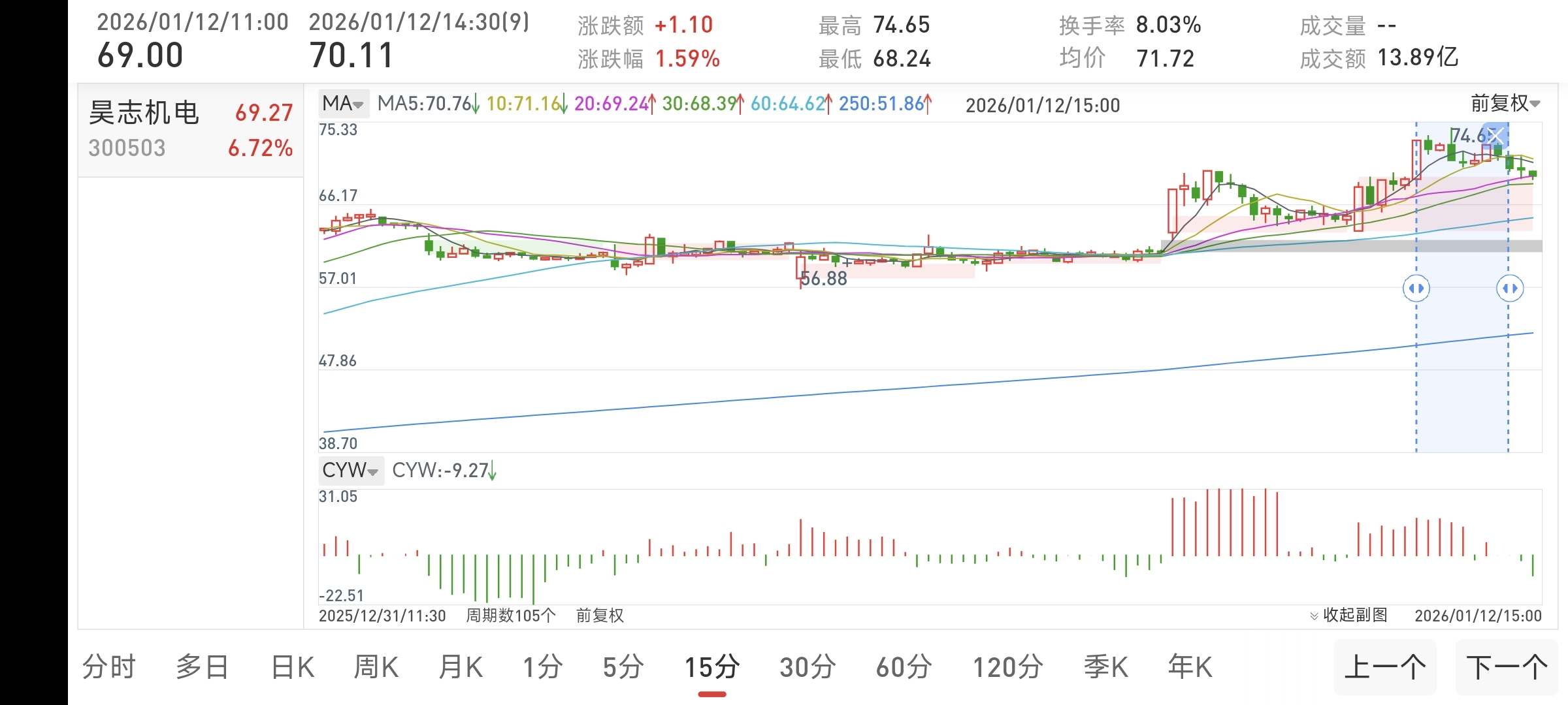 继续观察吧股价没有偏离均线太多,高位成交量也比较正常,大约14个亿左右机器人今天