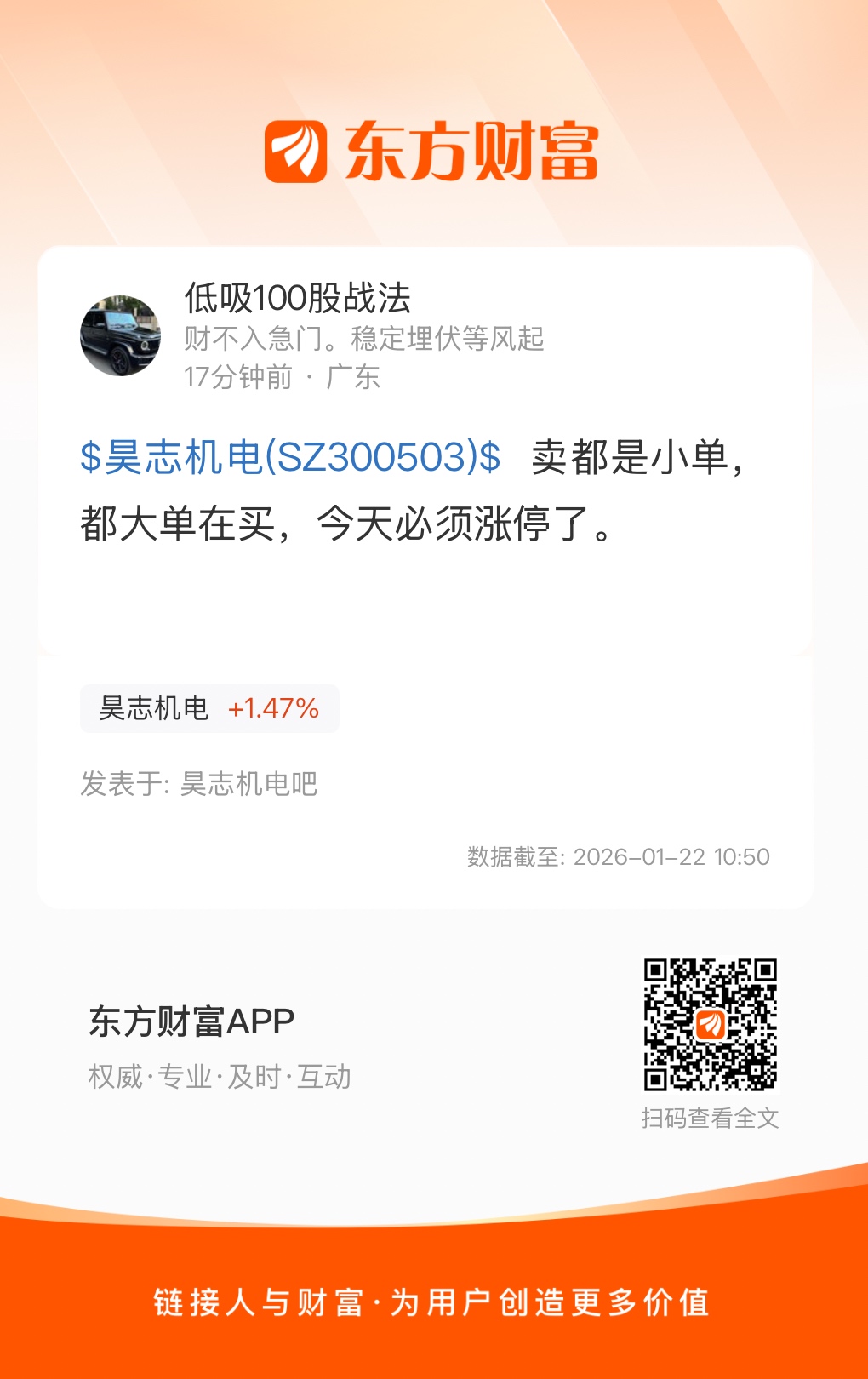 $昊志机电(SZ300503)$  卖都是小单,都大单在买,今天必须涨停了。