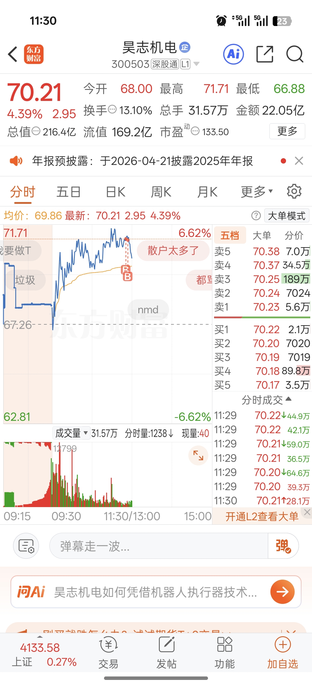 $昊志机电(SZ300503)$ 买在天上了