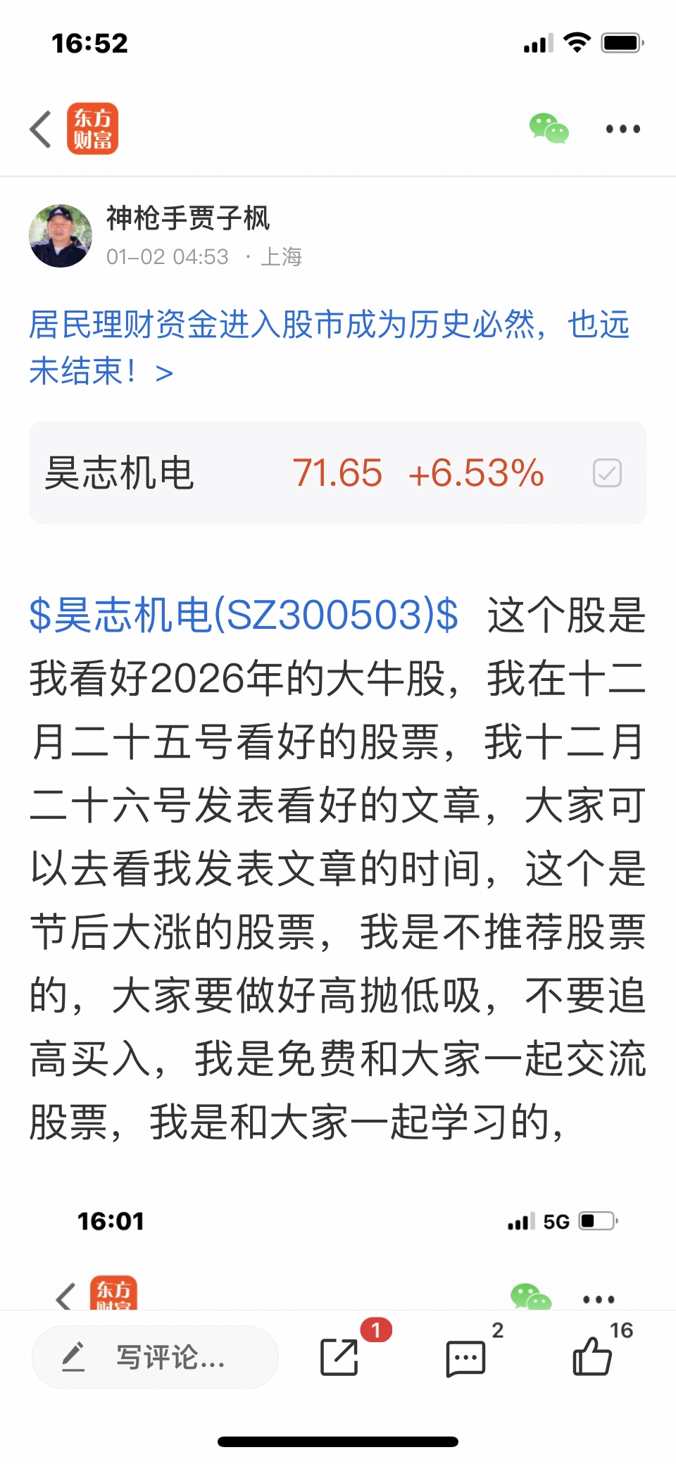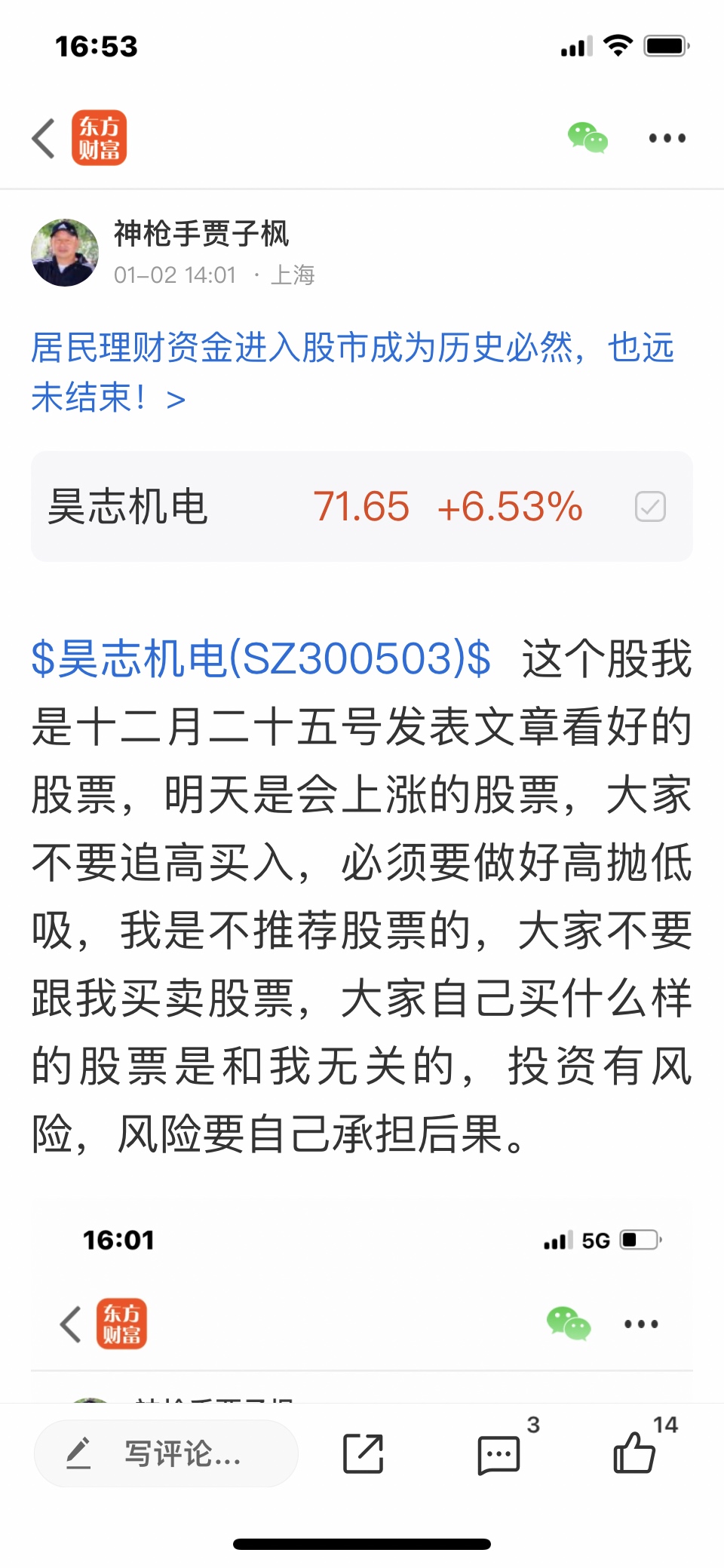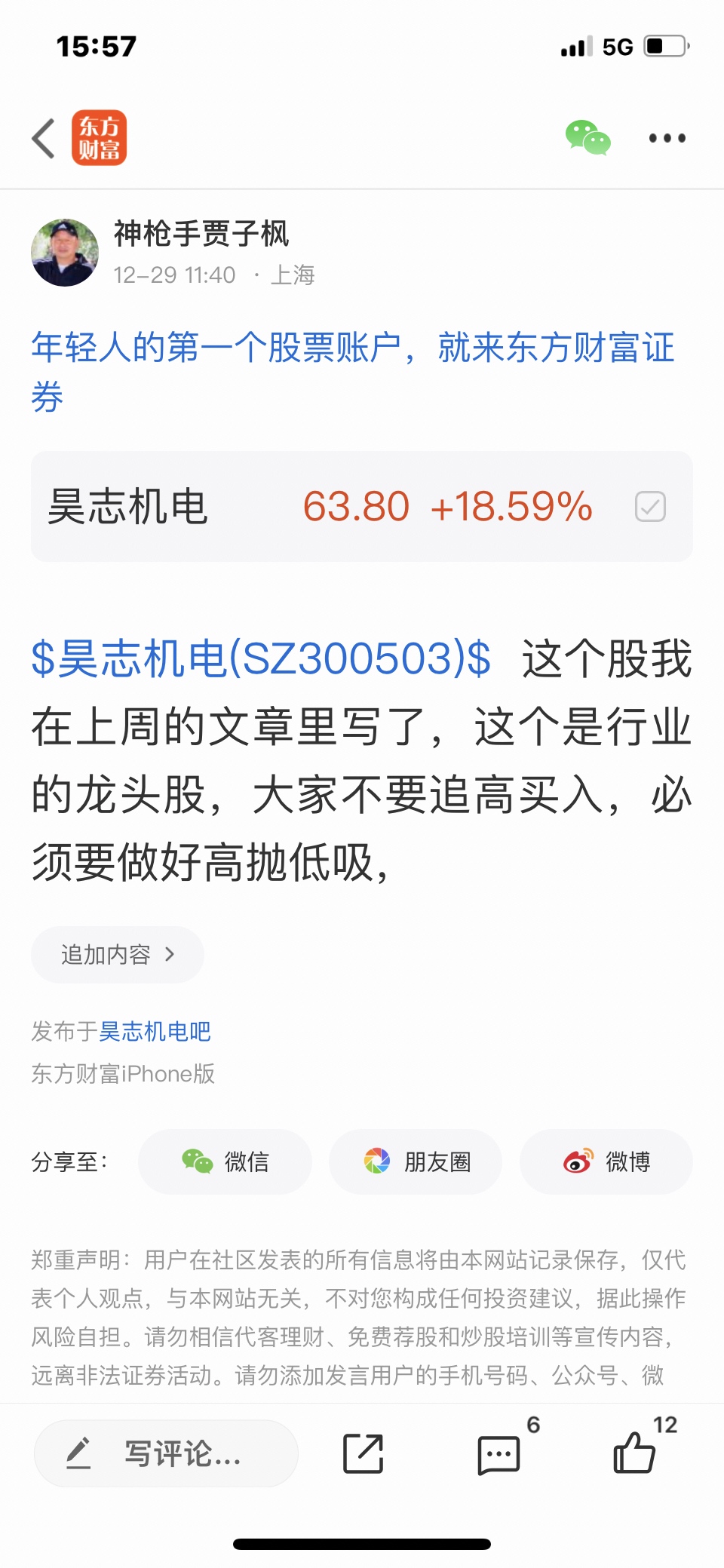 $昊志机电(SZ300503)$ 这个股我是十二月二十五号发表文章看涨的股票,这个股是调整中的股票,我判断基本调整好了,但是会有震荡的,大家不要追高买入,做好高抛低吸,我是不推荐股票的,大家不要跟我买卖股票,大家自己买什么样的股票是和我无关的,因为我是免费和大家一起交流股票,我是和大家一起学习的,我的观点仅供参考,不构成任何投资建议,投资有风险,风险要自己承担后果,