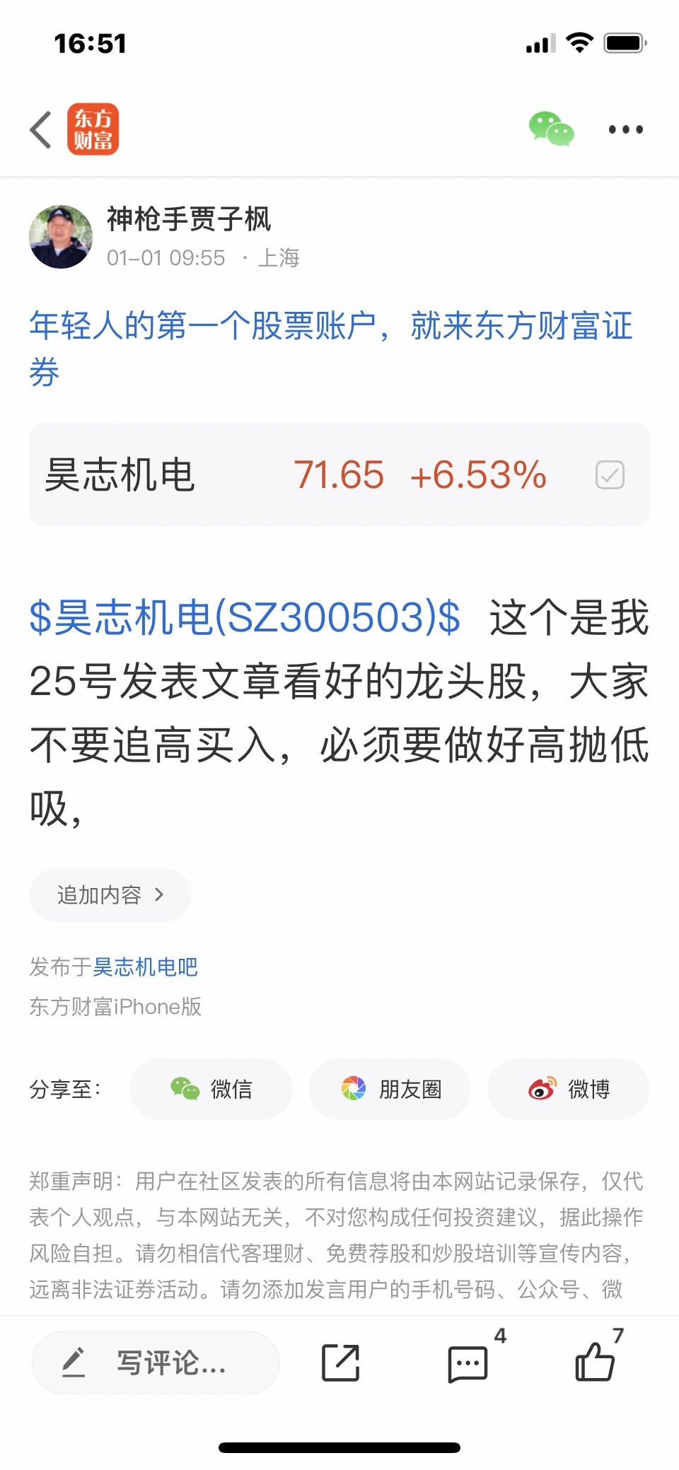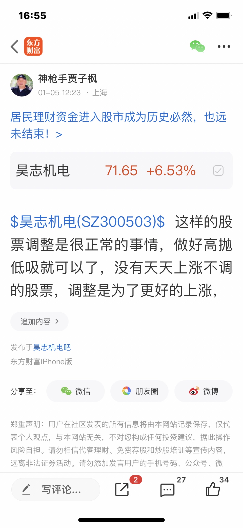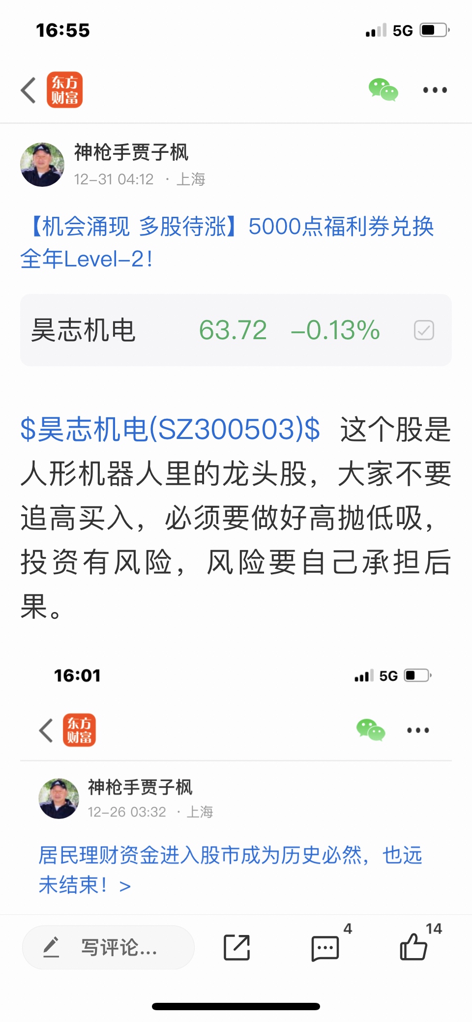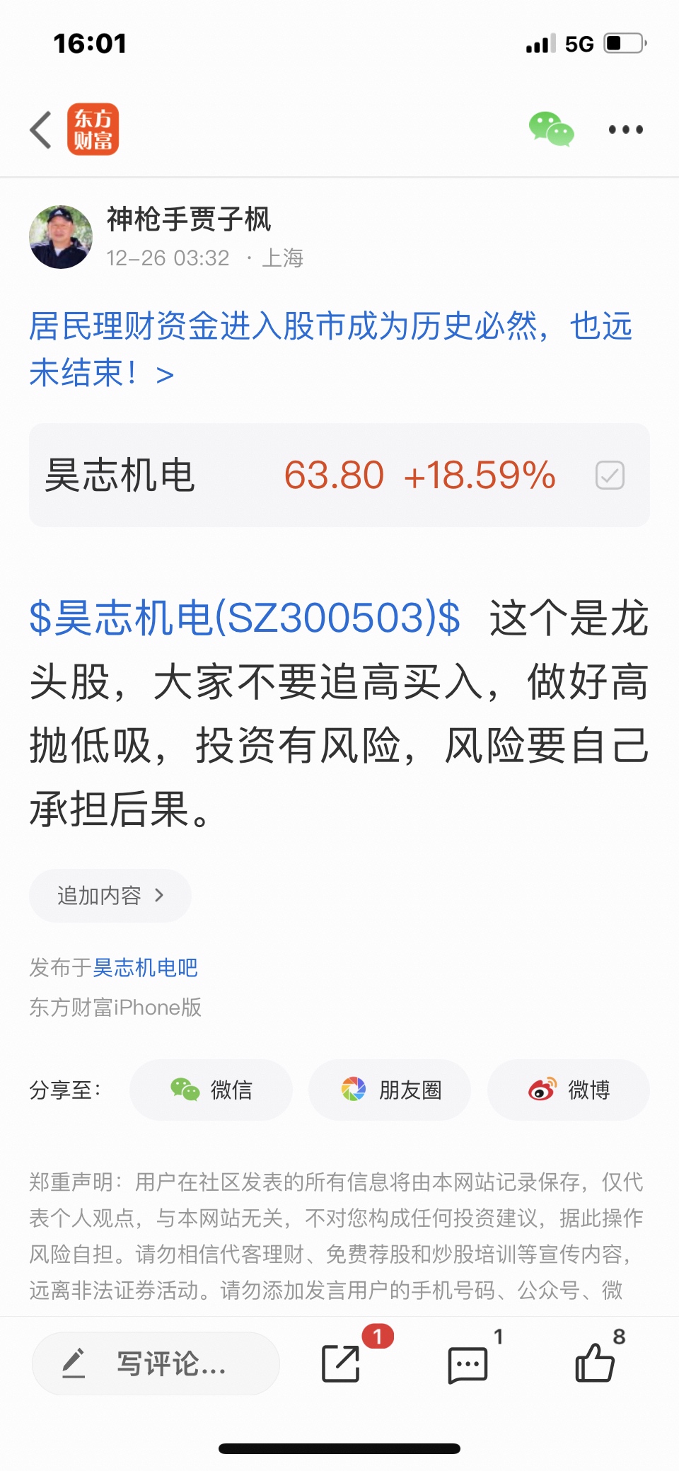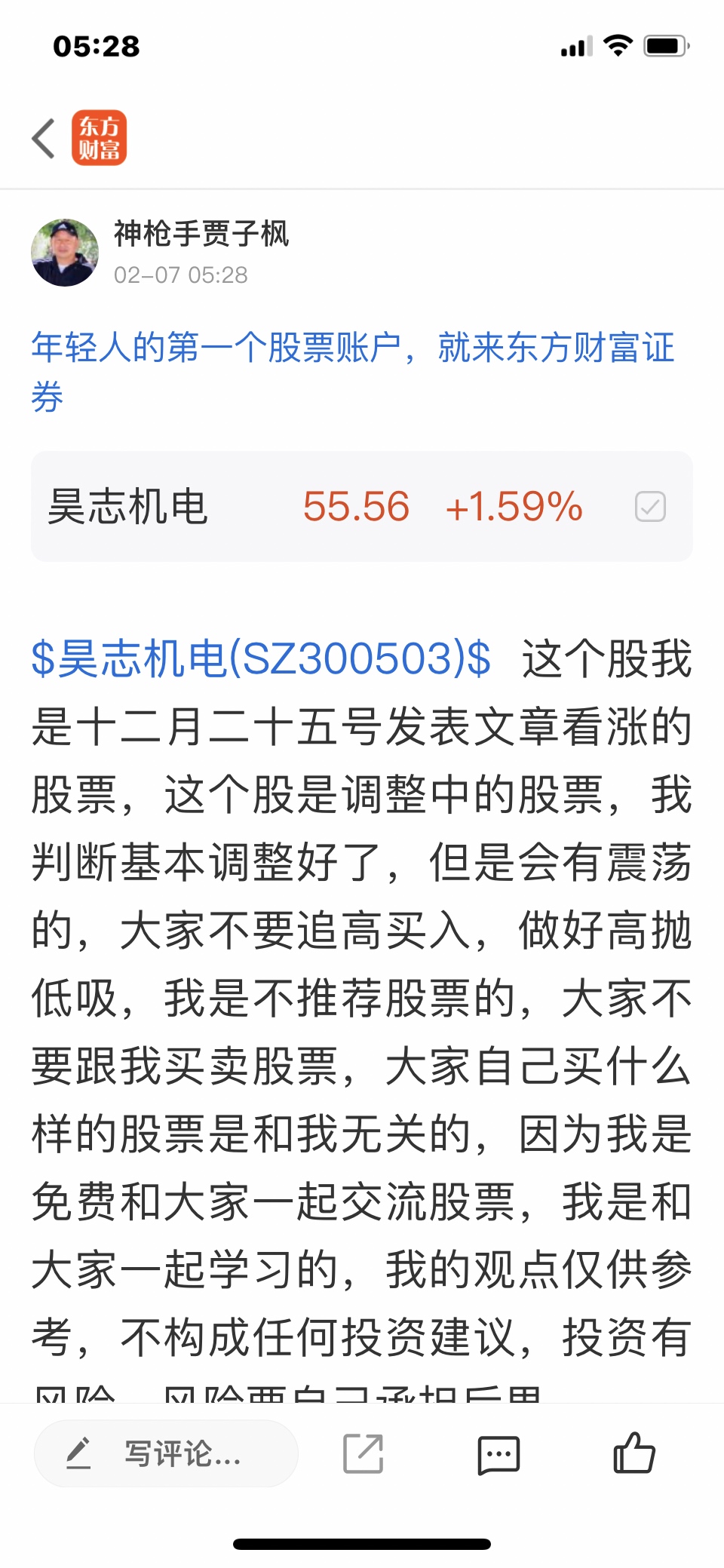 $昊志机电(SZ300503)$ 这个股我是十二月二十五号发表文章看涨的股票,我判断这个股基本调整好了,大家不要追高买入,我是不推荐股票的,大家不要跟我买卖股票,大家自己买什么样的股票是和我无关的,因为我是免费和大家一起交流股票,我是和大家一起学习的,我的观点仅供参考,投资有风险,风险要自己承担后果,