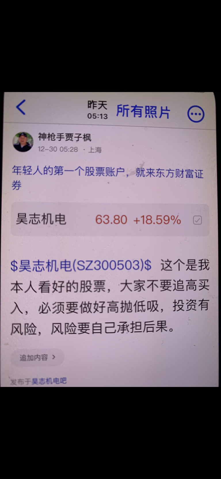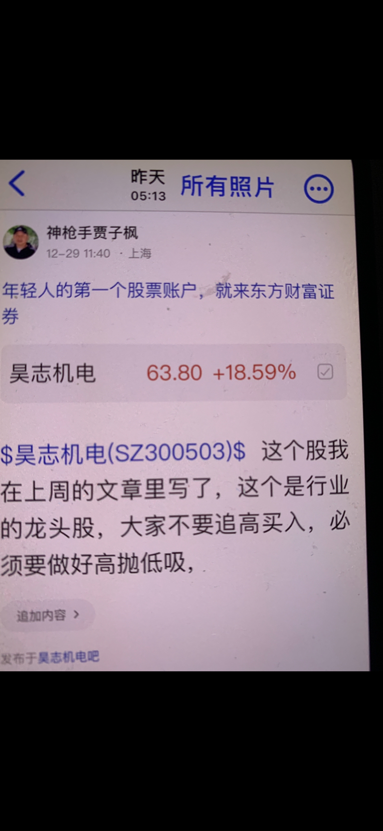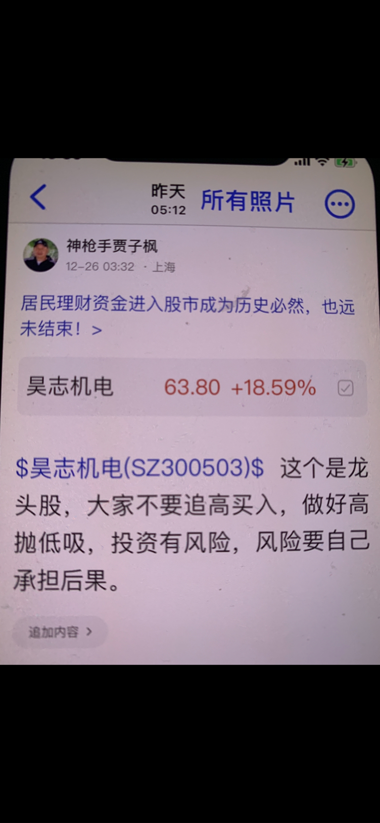 $昊志机电(SZ300503)$ 这个股是我十二月二十五号发表文章看涨的股票,大家不要追高买入,必须要做好高抛低吸,我是不推荐股票的,大家不要跟我买卖股票,大家自己买什么样的股票是和我无关的,因为我是免费和大家一起交流股票,我是和大家一起学习的,我的观点仅供参考,投资有风险,风险要自己承担后果,