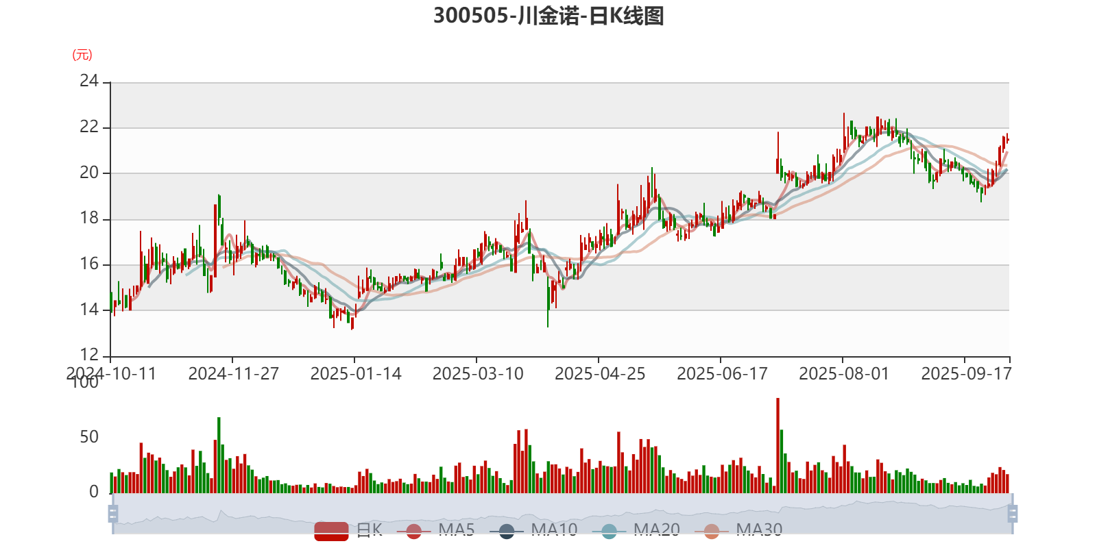 中证智能财讯川金诺(300505)10月10日晚间披露业绩预告,预计2025年前三季度实现营业收入27.5亿元至28.5亿元,同比增长24.99%-29.54%;归母净利润2.9亿元至3.1亿元,同比增长162.56%-180.66%;扣非净利润预计2.76亿元至2.96亿元,同比增长172.88%-192.63%。以10月10日收盘价计算,川金诺目前市盈率(TTM)约为15.73倍-16.62倍,市净率(LF)约2.24倍,市销率(TTM)约1.55倍。