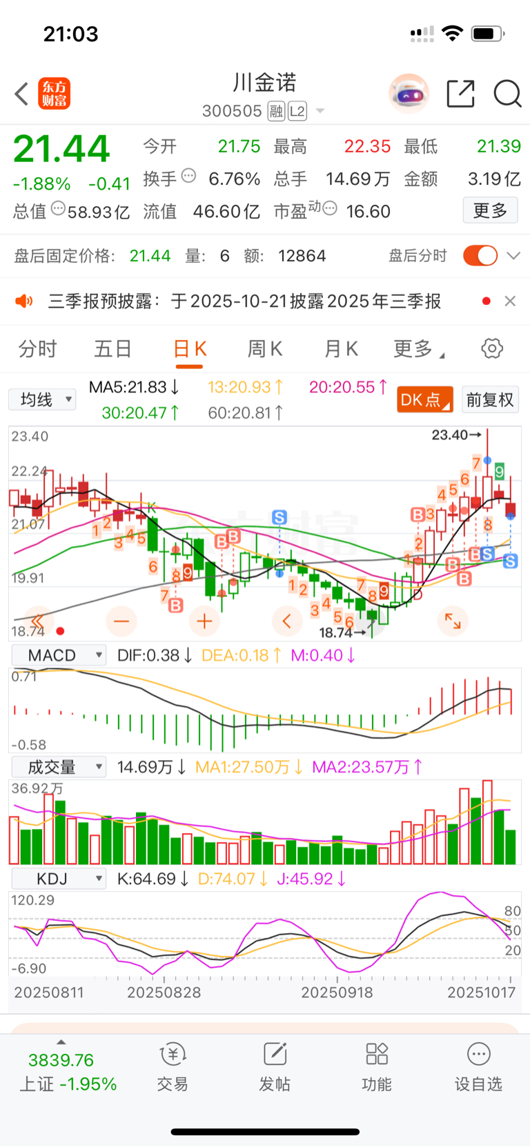 $川金诺(SZ300505)$ 已经出完,大盘不好,回避一下,有机会就接,没机会就祝大家发财