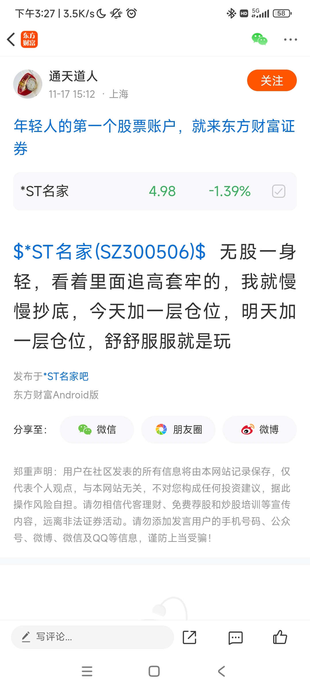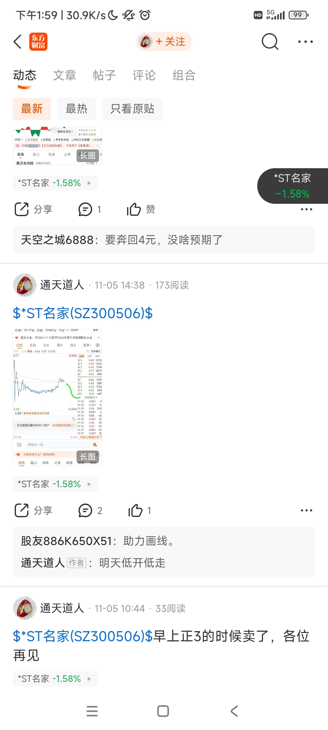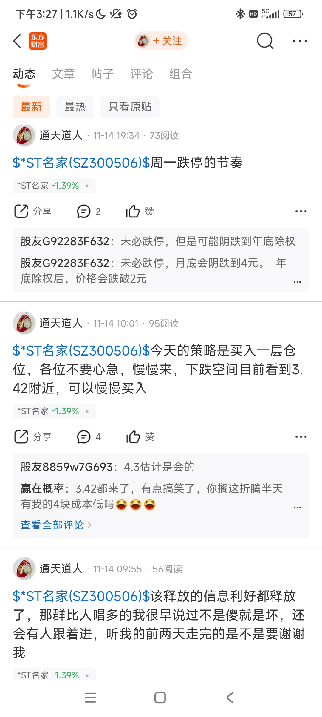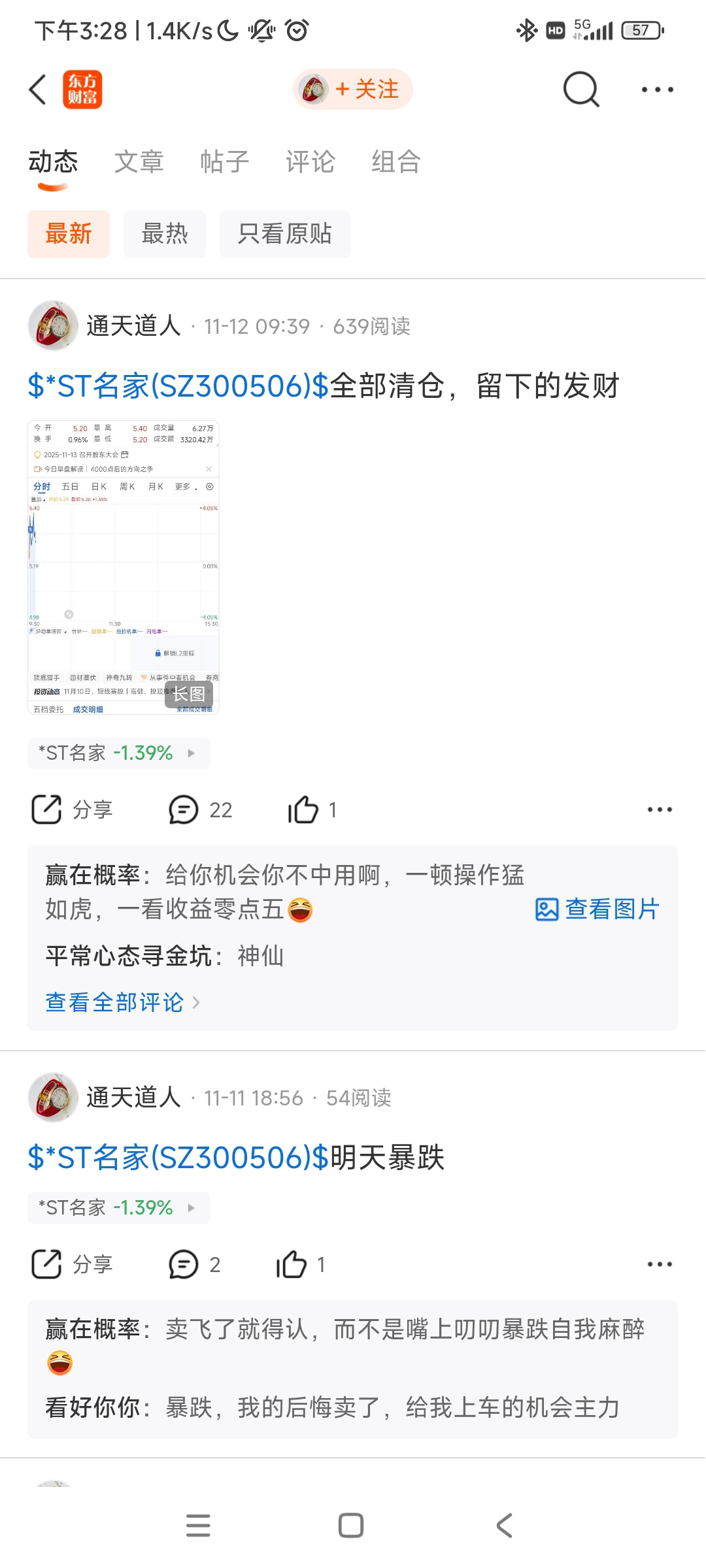 $*ST名家(SZ300506)$ 有些人都是用嘴巴加减仓的嘛?5号减仓10号唱空,12号清仓,14号又说加仓一层,今天17号又说无股等抄底。前后自相矛盾不过如此啊。