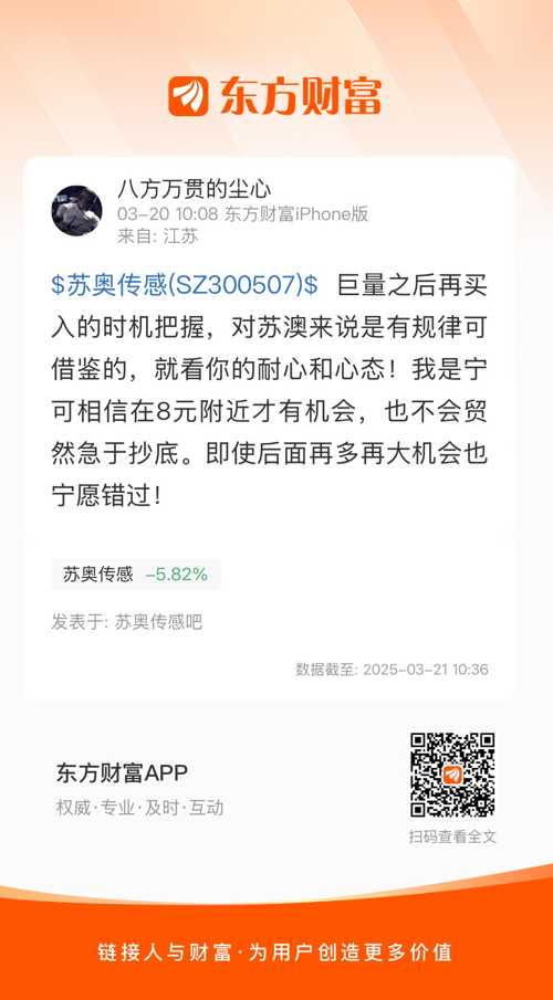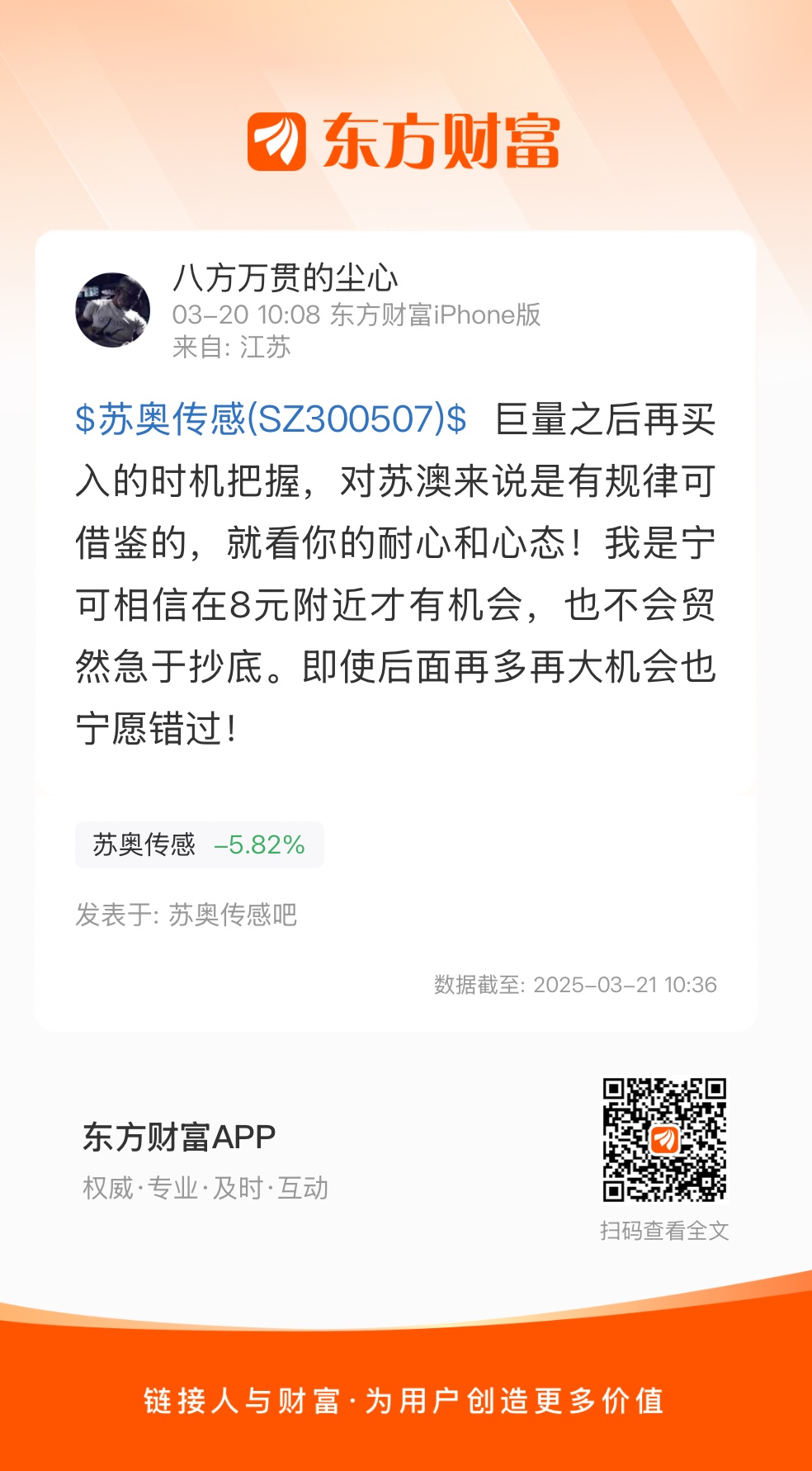 $苏奥传感(SZ300507)$ 巨量之后再买入的时机把握,对苏澳来说是有规律可借鉴的,就看你的耐心和心态!我是宁可相信在8元附近才有机会,也不会贸然急于抄底。即使后面再多再大机会也宁愿错过!