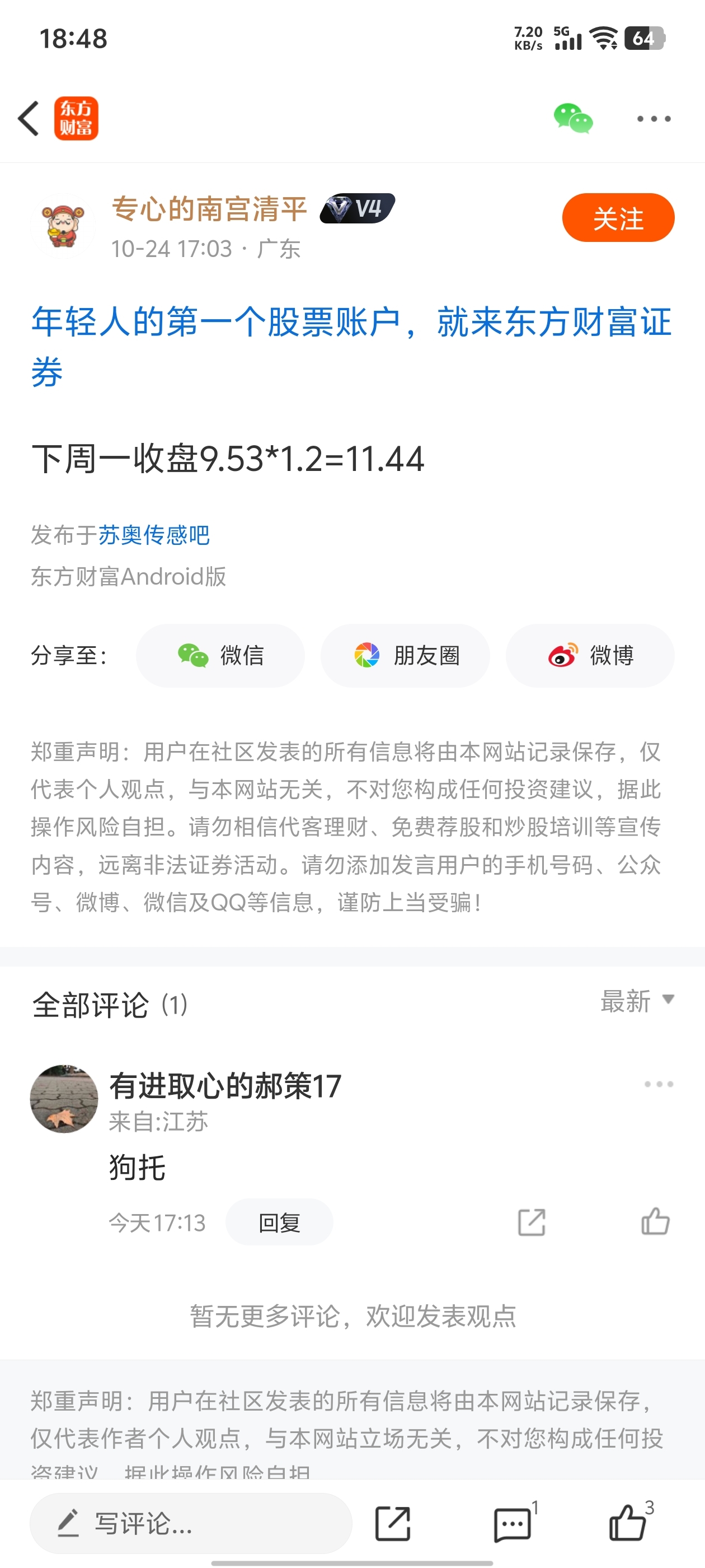 温馨提示: 1.根据《证券法》规定,禁止编造、传播虚假信息或者误导性信息,扰乱证券市场;2.用户在本社区发表的所有资料、言论等仅代表个人观点,与本网站立场无关,不对您构成任何投资建议。用户应基于自己的独立判断,自行决定证券投资并承担相应风险。《东方财富社区管理规定》