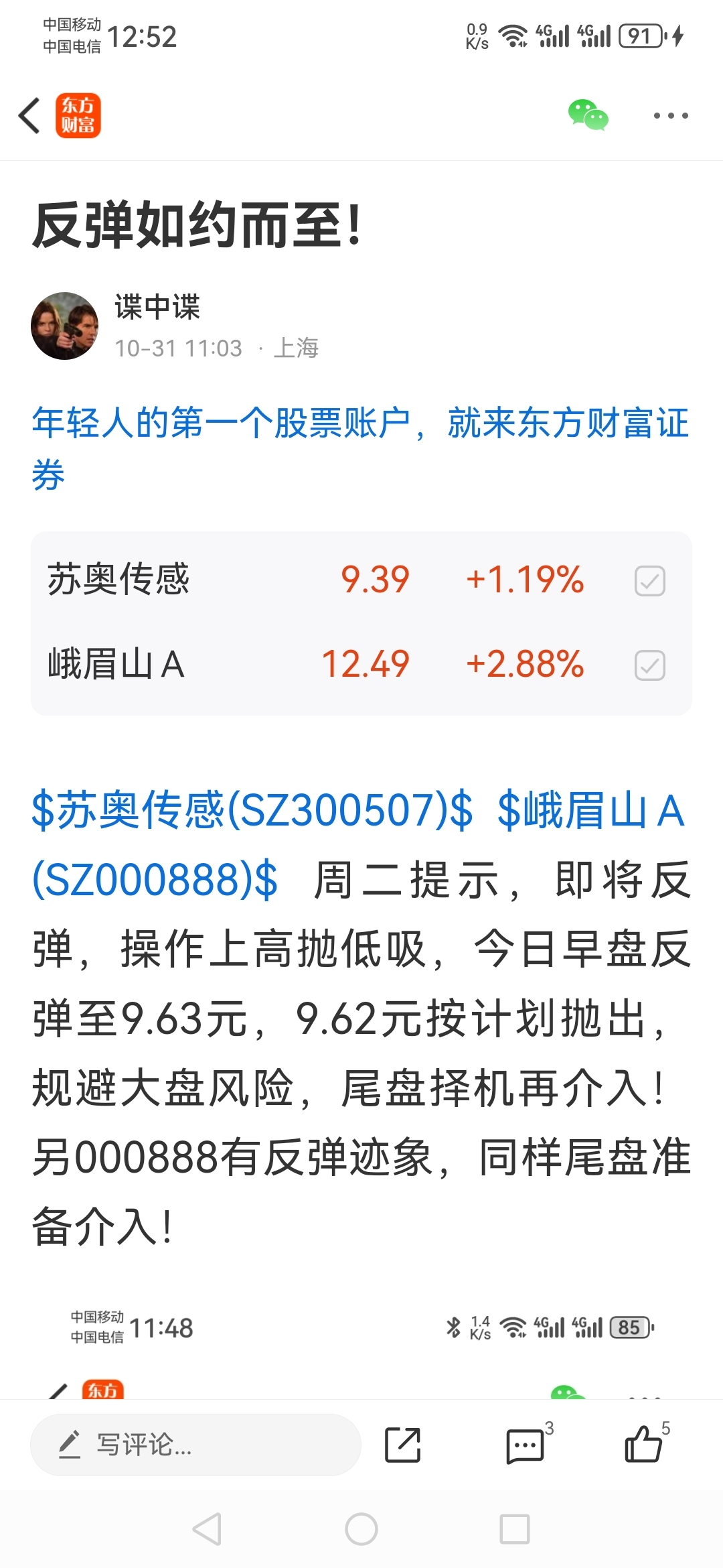 $苏奥传感(SZ300507)$ 按之前计划,周五冲高在9.62元处抛出,尾盘9.44元接回,高抛低吸,摊低成本,中线没问题,故大胆持股,保持半仓操作。$峨眉山A(SZ000888)$ 上午关注,下午收上去了,决定观望。