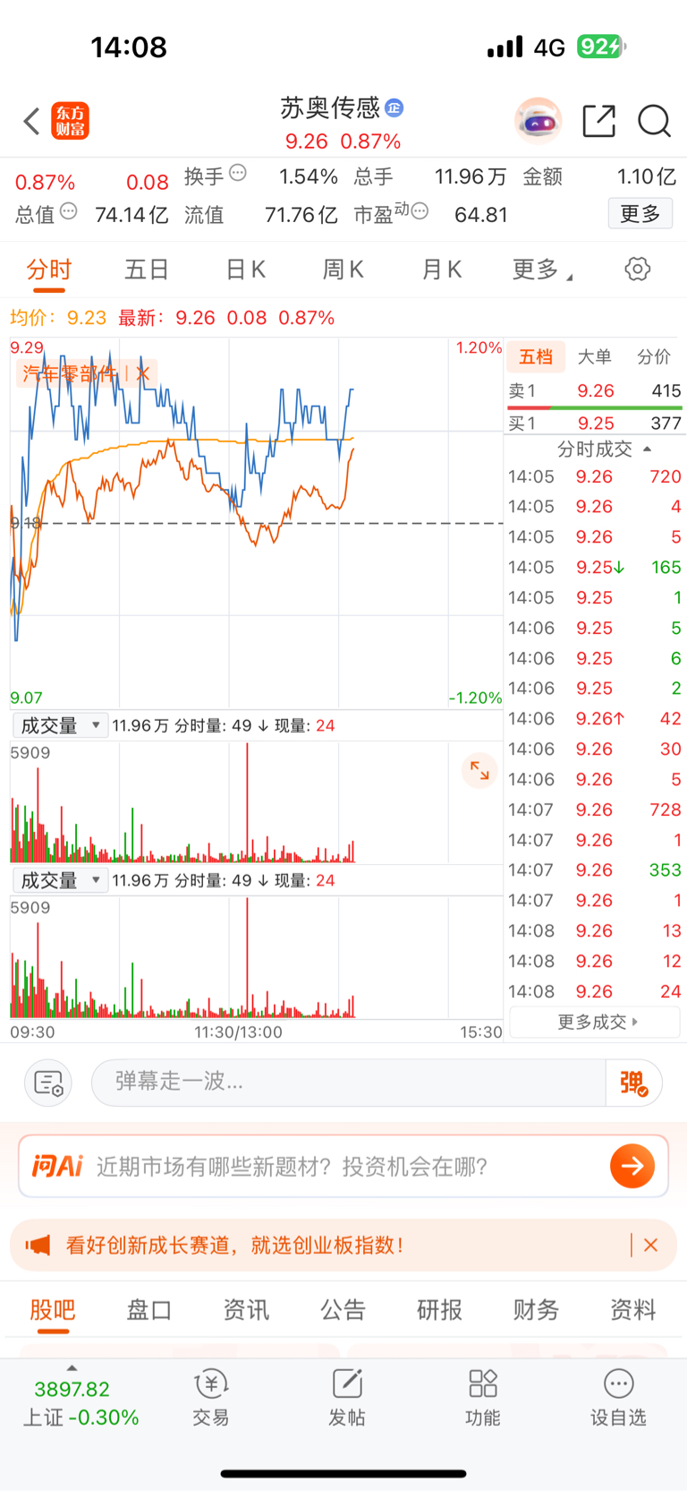 $苏奥传感(SZ300507)$ 恭喜汽车零部件板块里面的票,又大涨