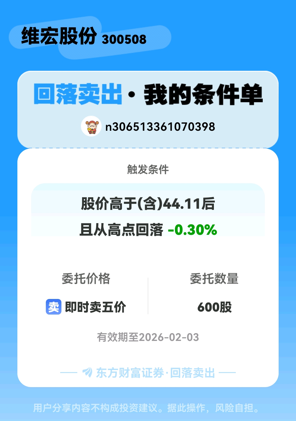 #条件单交流# #回落卖出晒单# 一位股神设置了一个回落卖出条件单,接下来就是见证奇迹的时刻~$维宏股份(SZ300508)$