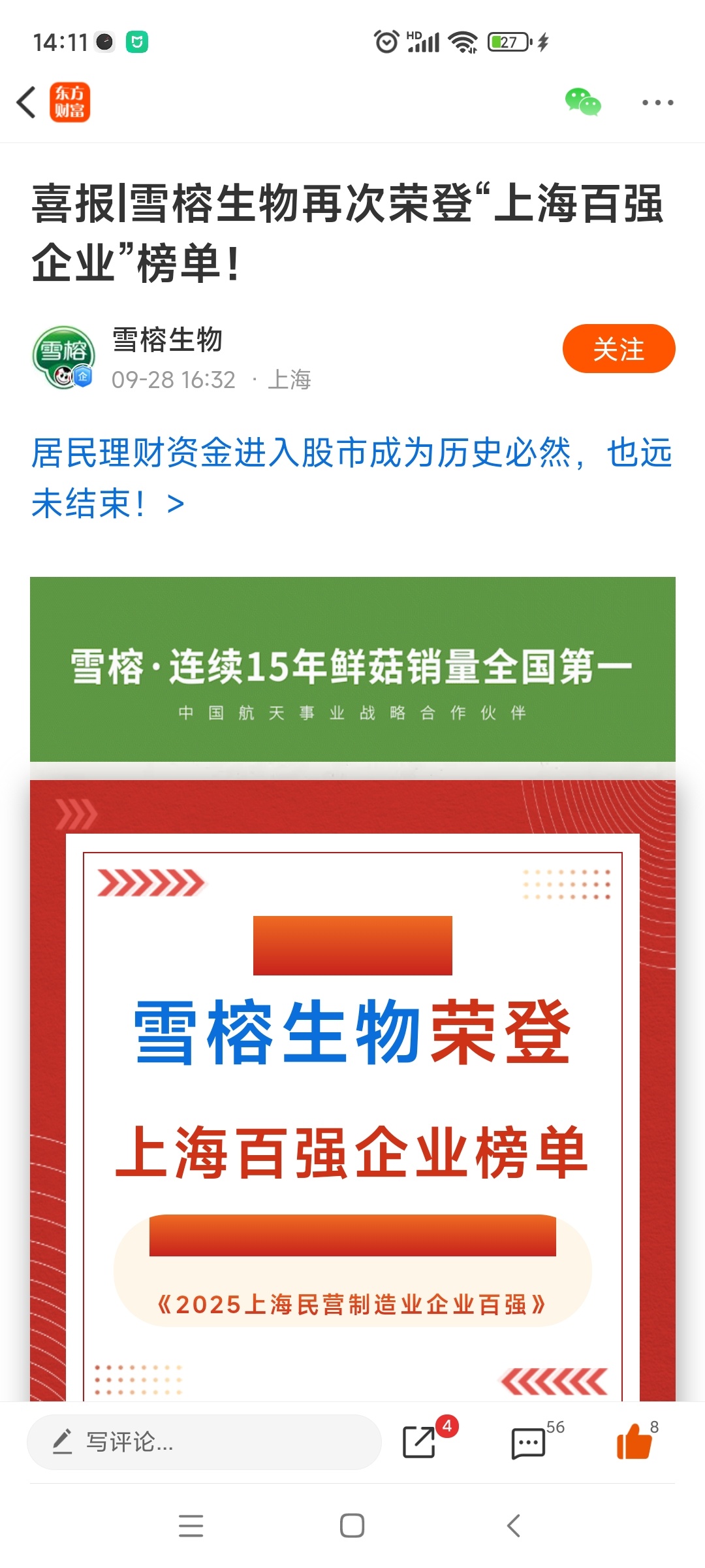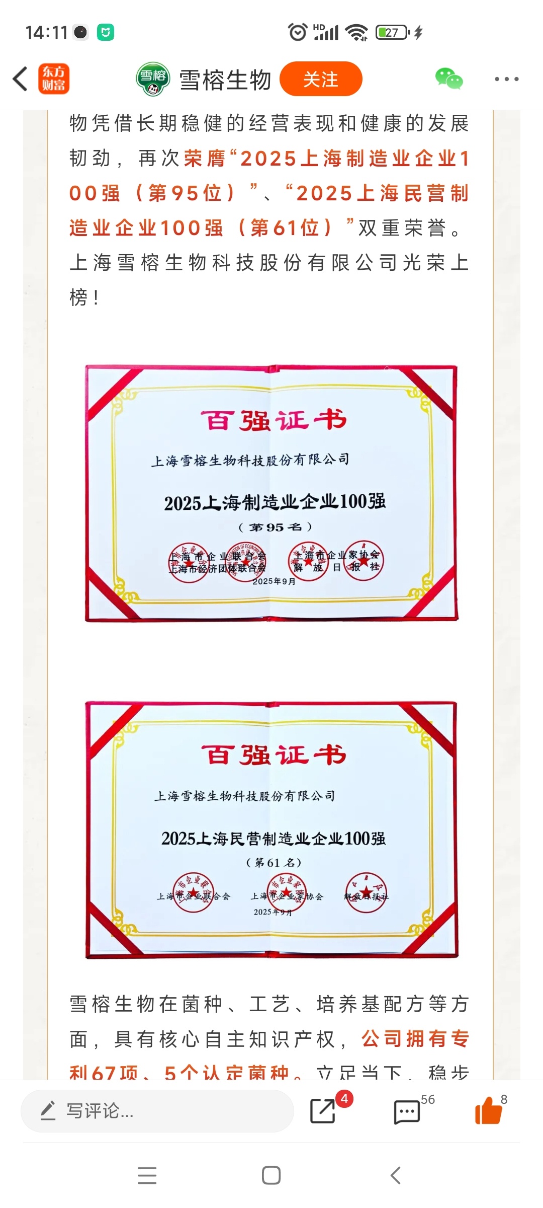 喜报|雪榕生物再次荣登“上海百强企业”榜单!