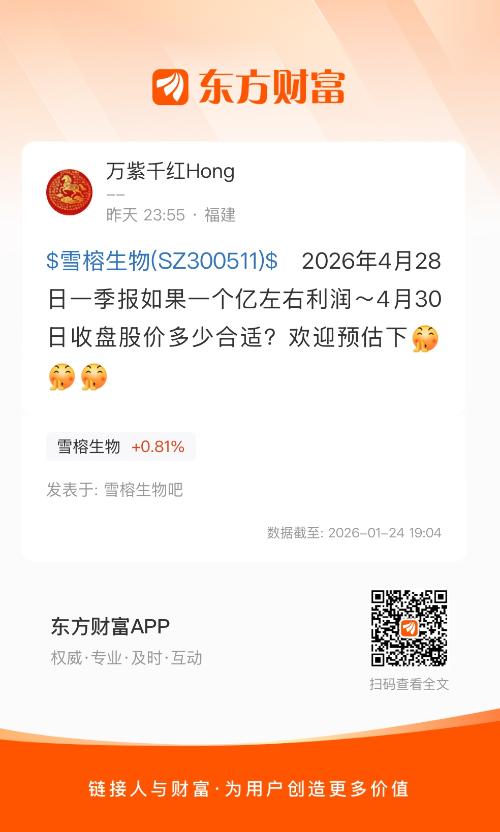 $雪榕生物(SZ300511)$   2026年4月28日一季报如果一个亿左右利润~4月30日收盘股价多少合适?欢迎预估下