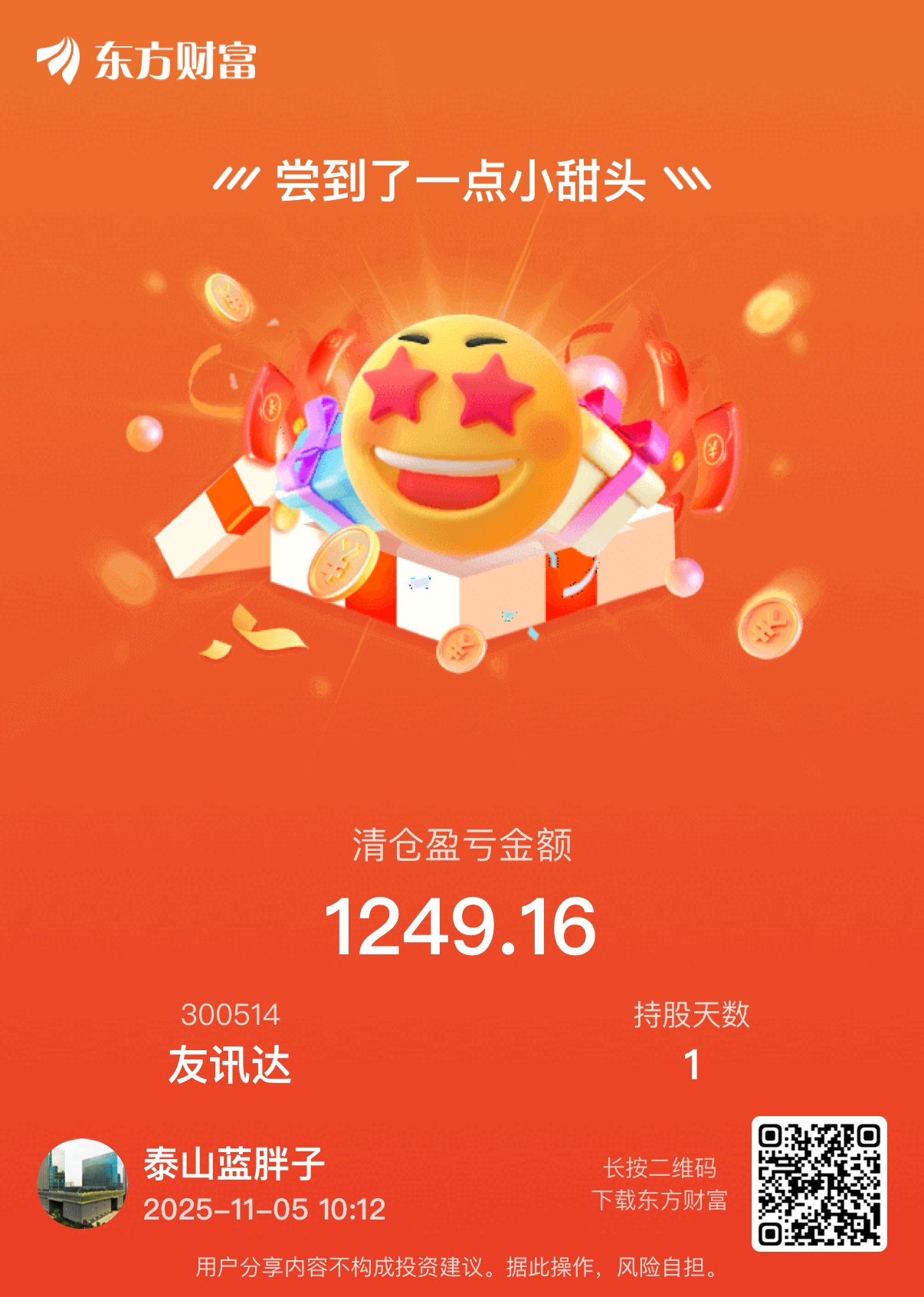 $友讯达(SZ300514)$ 快进快出,小赚1千