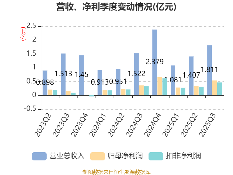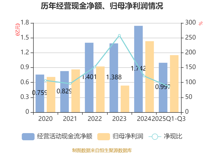 2025年前三季度,公司经营活动现金流净额为9972.55万元,同比增长58.82%;筹资活动现金流净额-6378.31万元,同比增加1172.87万元;投资活动现金流净额-4827.65万元,上年同期为-8780.4万元。