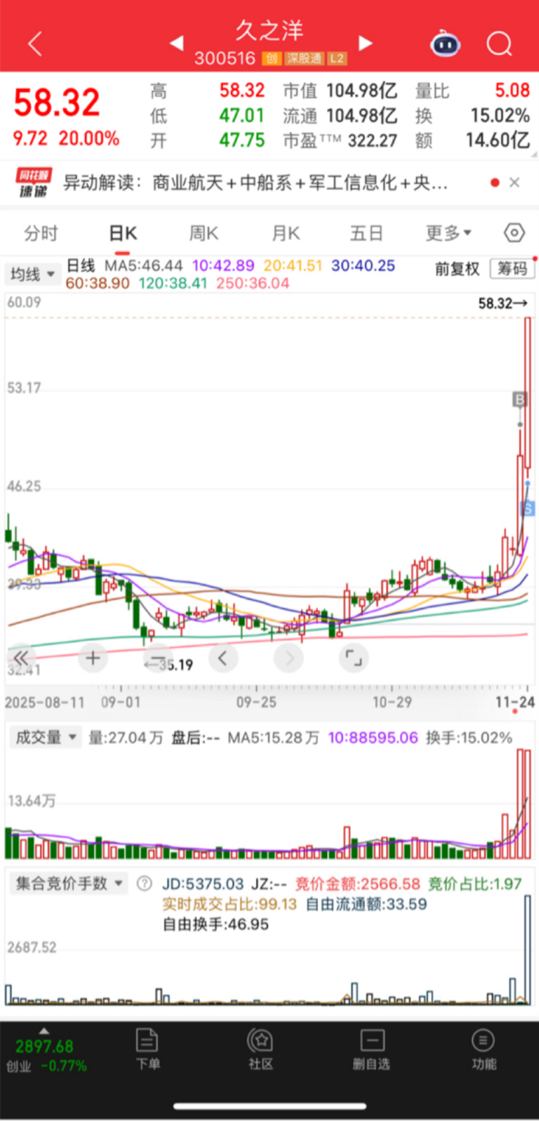 $久之洋(SZ300516)$ 周五就说三个板块 AI应用 军工 地产 ,还说潜伏商业航天 ,今天走的都还可以吧 相比其他板块我认为强太多了 唯一说错的是短线情绪 没修复 这个有点没想到 下午看看短线这块修复情况 ,我感觉是机会 。航天发展信我的也全都吃肉了
