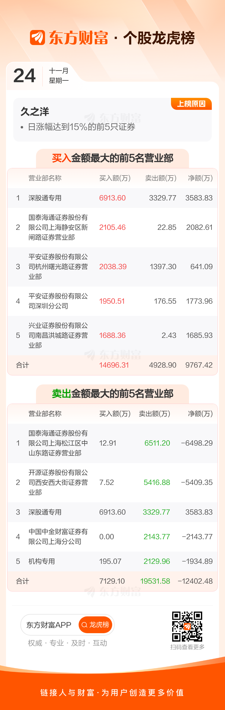 交易所2025年11月24日公布的交易公开信息显示,久之洋因成为日涨幅达到15%的前5只证券、连续三个交易日内,涨幅偏离值累计达到30%的证券上榜。久之洋当日收报58.32元,涨跌幅20.00%,偏离值20.00%,换手率15.69%,成交额15.30亿。异常期间11月21日至11月24日,期间涨幅38.76%,累计偏离值41.30%,区间成交额28.48亿。