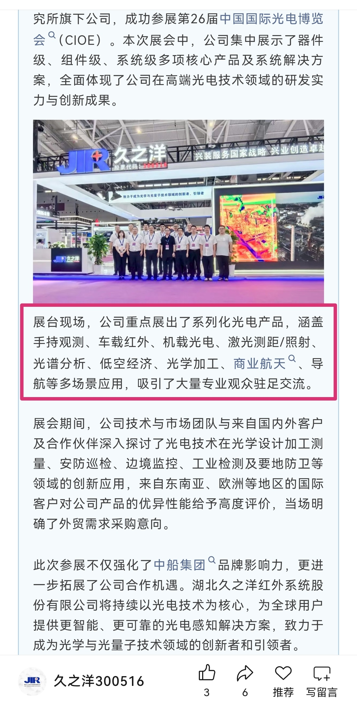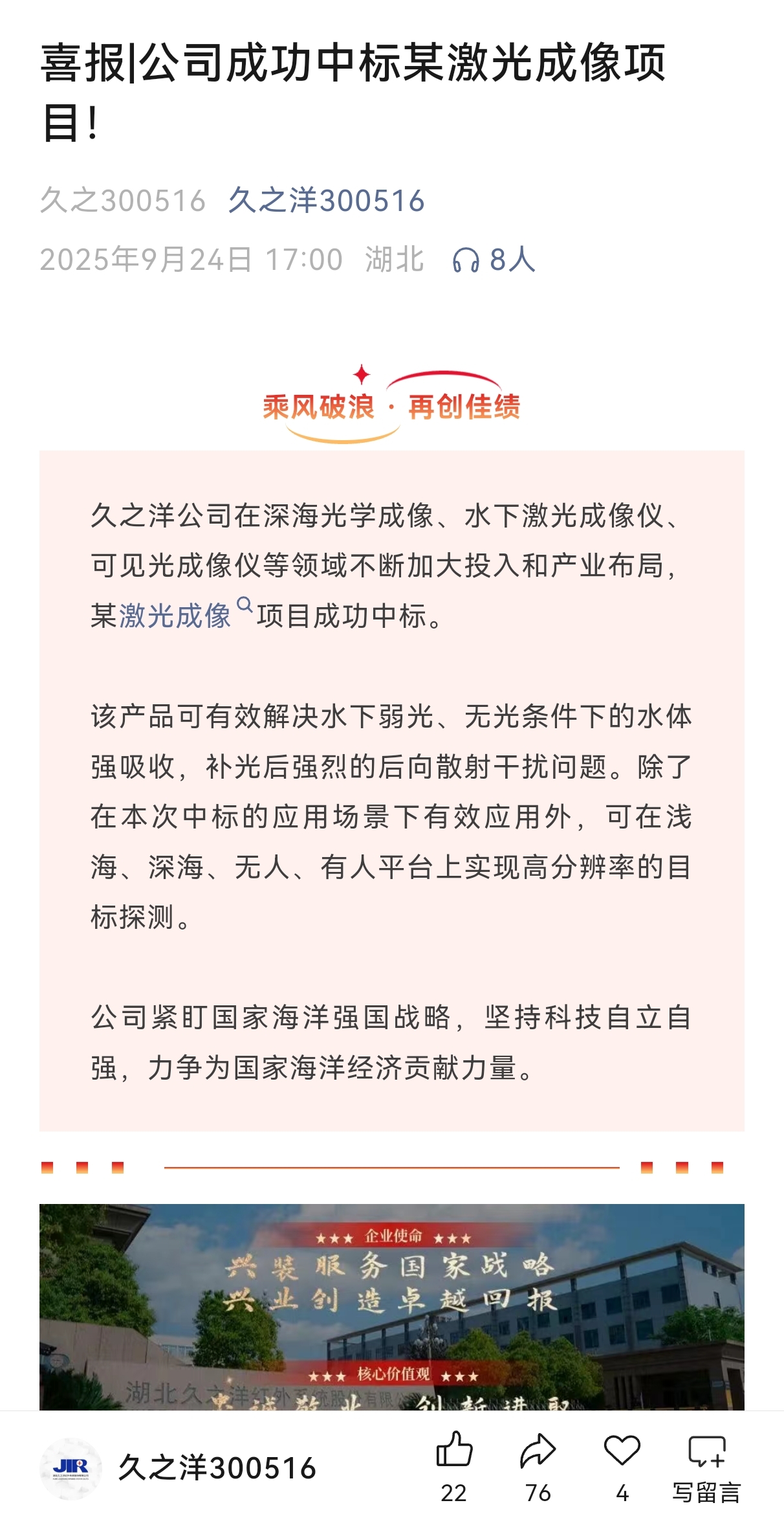 $久之洋(SZ300516)$ 追高进来有点瑟瑟发抖,看了下公司业绩不咋滴,主要作为重要军工央企、以服务国家战略为主,民用占比小。但是公司技术和产品涵盖商业航天+低空经济+深海科技+光量子+航母概念+军工信息化+海陆空天防务等新质生产力及新质战斗力众多领域,而且控股方实力雄厚,上市十年从不减持这点就可以打败95%的上市公司了、并且还收购合并了二股东北京派鑫持有公司的全部股份。