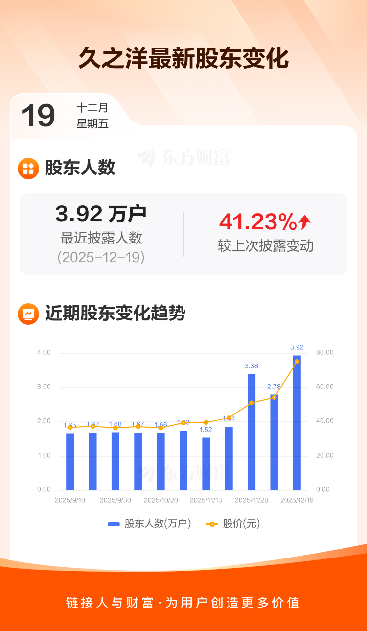 久之洋最新披露数据显示,截至12月19日公司股东户数为3.92万户,较上期(2025年12月10日)增加1.14万户,增幅为41.23%。户均持有流通股数量由上期的6482股下降至4589股,户均持股金额由上期的34.93万元减少至34.36万元。