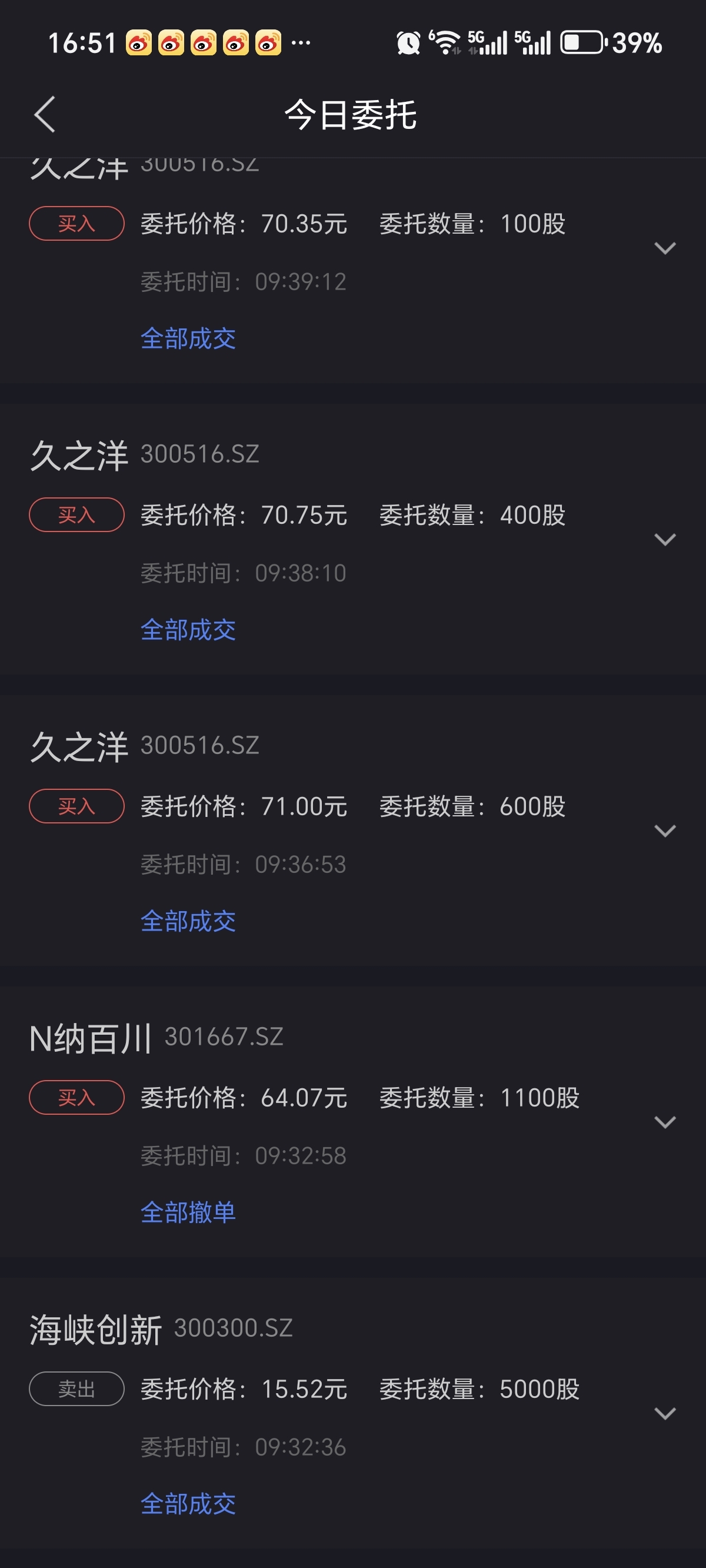 $久之洋(SZ300516)$ 财运跟人,既来之则安之,今早卖了海峡创新,想买纳百川,结果64多点没成交,撤单了,买了久之洋,哎,这一天看着都是泪。我上图,你们品。