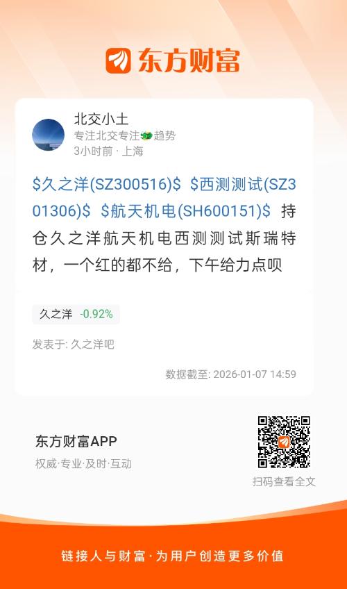 $久之洋(SZ300516)$ $西测测试(SZ301306)$ $航天机电(SH600151)$ 持仓久之洋航天机电西测测试斯瑞特材,一个红的都不给,下午给力点呗