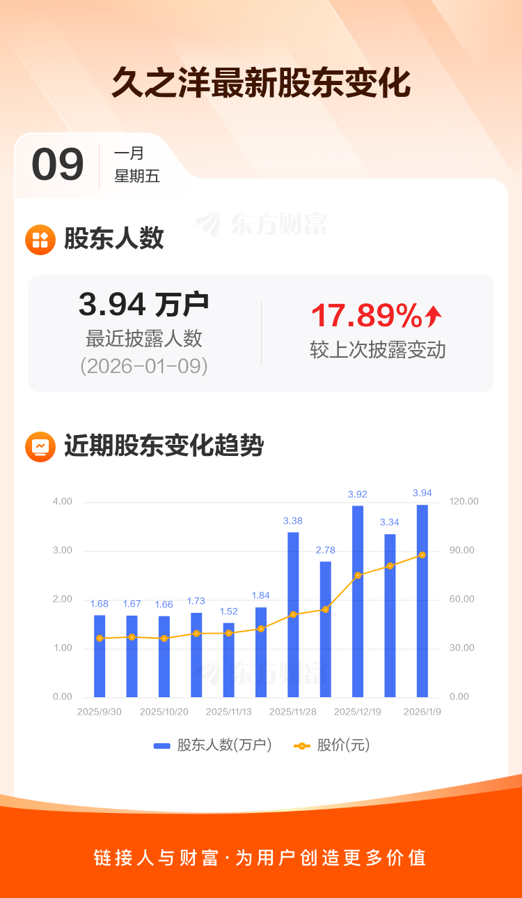 久之洋:截至1月9日最新股东户数3.94万户,较上期增加17.89%