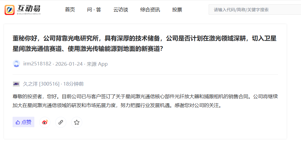 久之洋:已签订星间激光通信核心部件销售合同