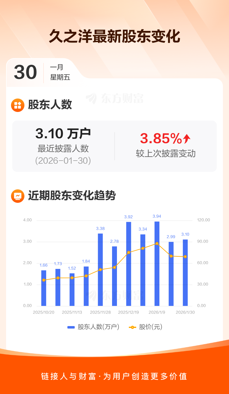 久之洋:截至1月30日最新股东户数3.10万户,较上期增加3.85%