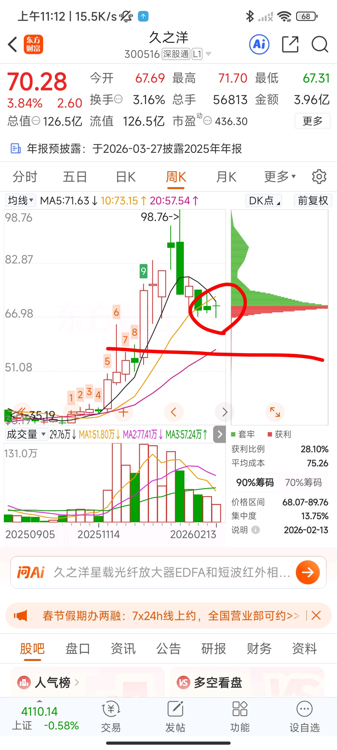 $久之洋(SZ300516)$ 周线死叉半山腰十字星,加上过节的时候国际形势动荡,当心年后跌停出不来