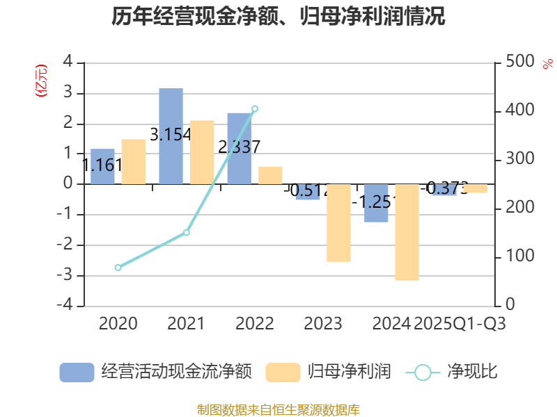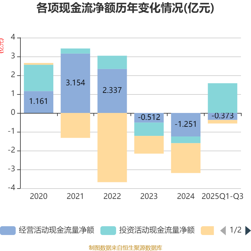 2025年前三季度,公司经营活动现金流净额为-3732.21万元,同比增加5819.17万元;筹资活动现金流净额-1871.86万元,同比增加1.28亿元;投资活动现金流净额1.58亿元,上年同期为-8229.56万元。