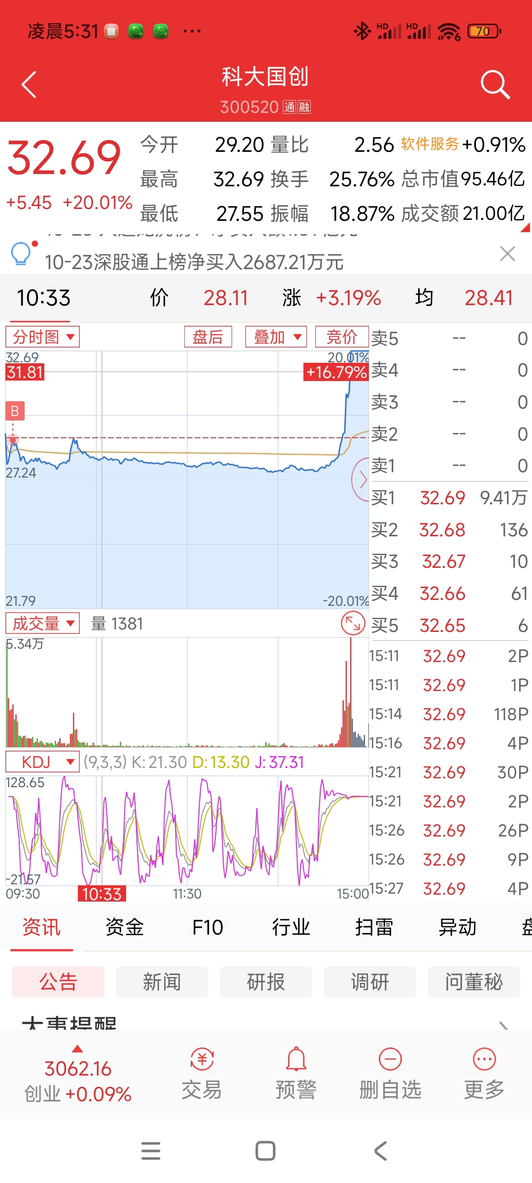 早盘高点买入。随后就开始跌跌不休。心情极度郁闷,没想到尾盘给了惊喜。不知道明天情