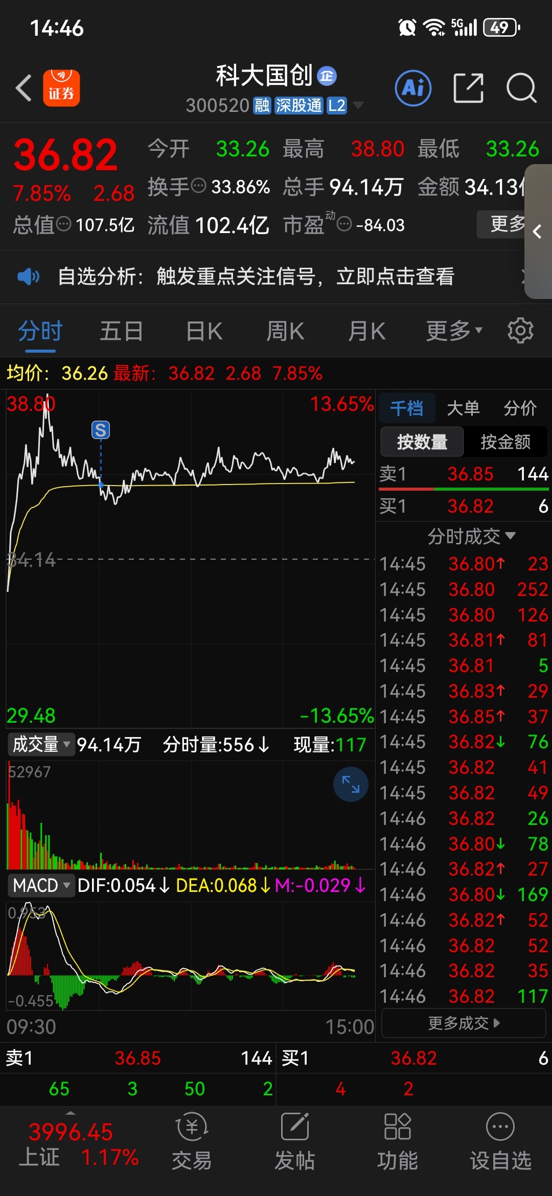 $科大国创(SZ300520)$ 分时均线上卖了,也不知有没有卖飞