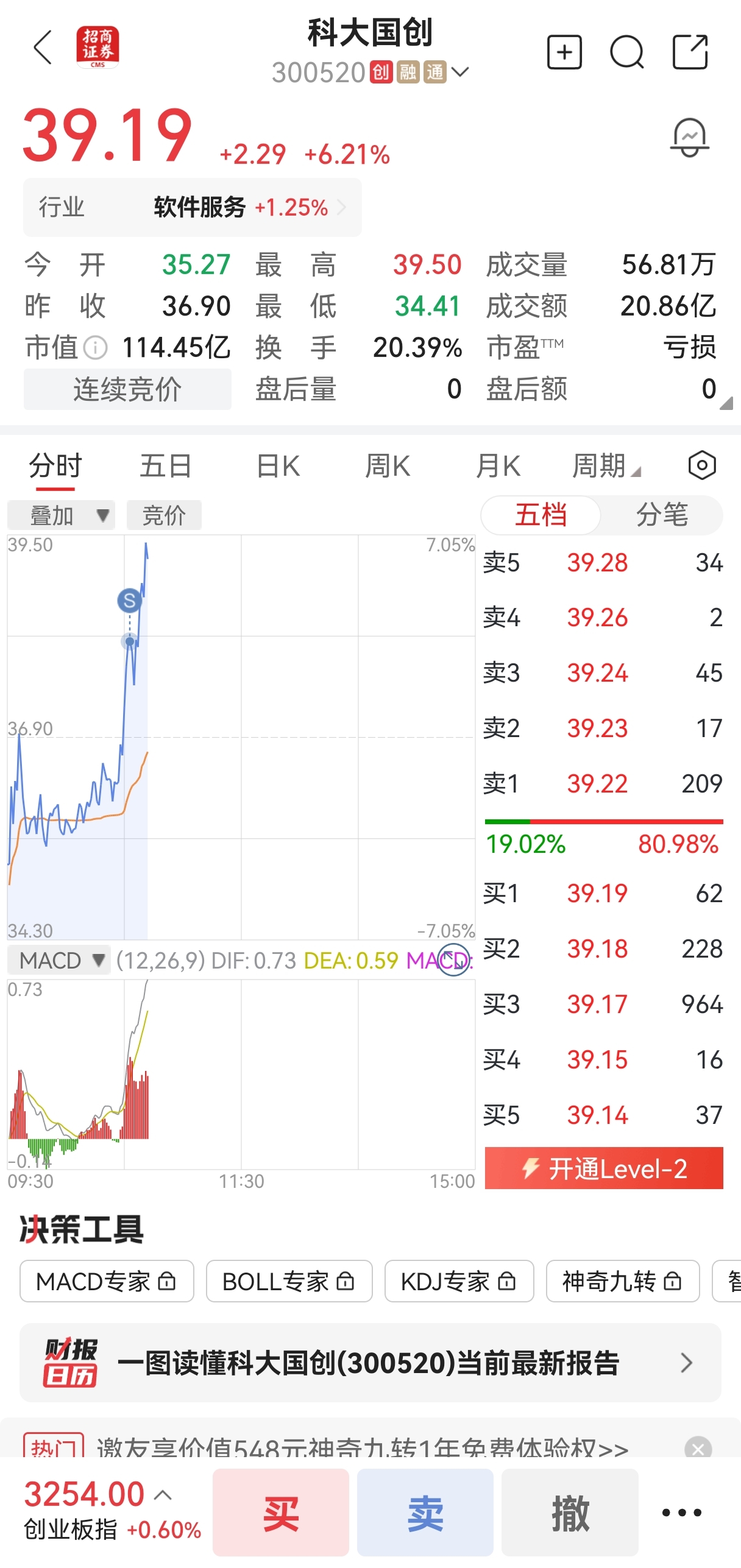 $科大国创(SZ300520)$ 卖飞了,今天还能下来吗,我想买回来
